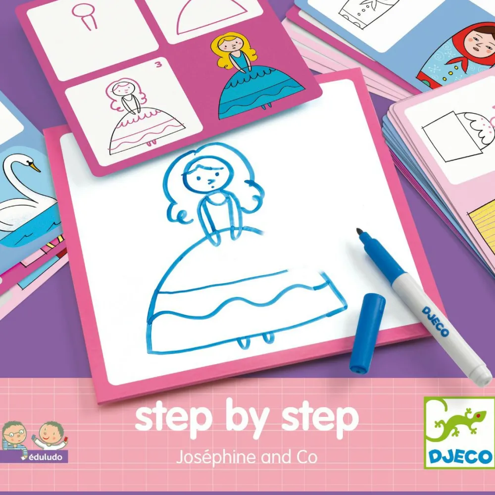 I denne solide æske finder I 24 kort med nemme trin-for-trin vejledninger til, hvordan I med meget få streger og virkemidler kan tegne forskellige dyr og ting fra pigen Josephines yndige verden.