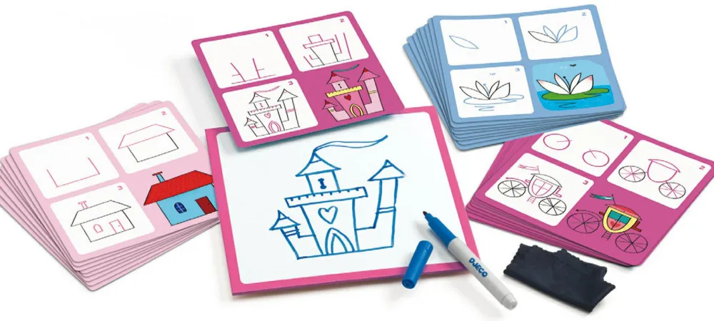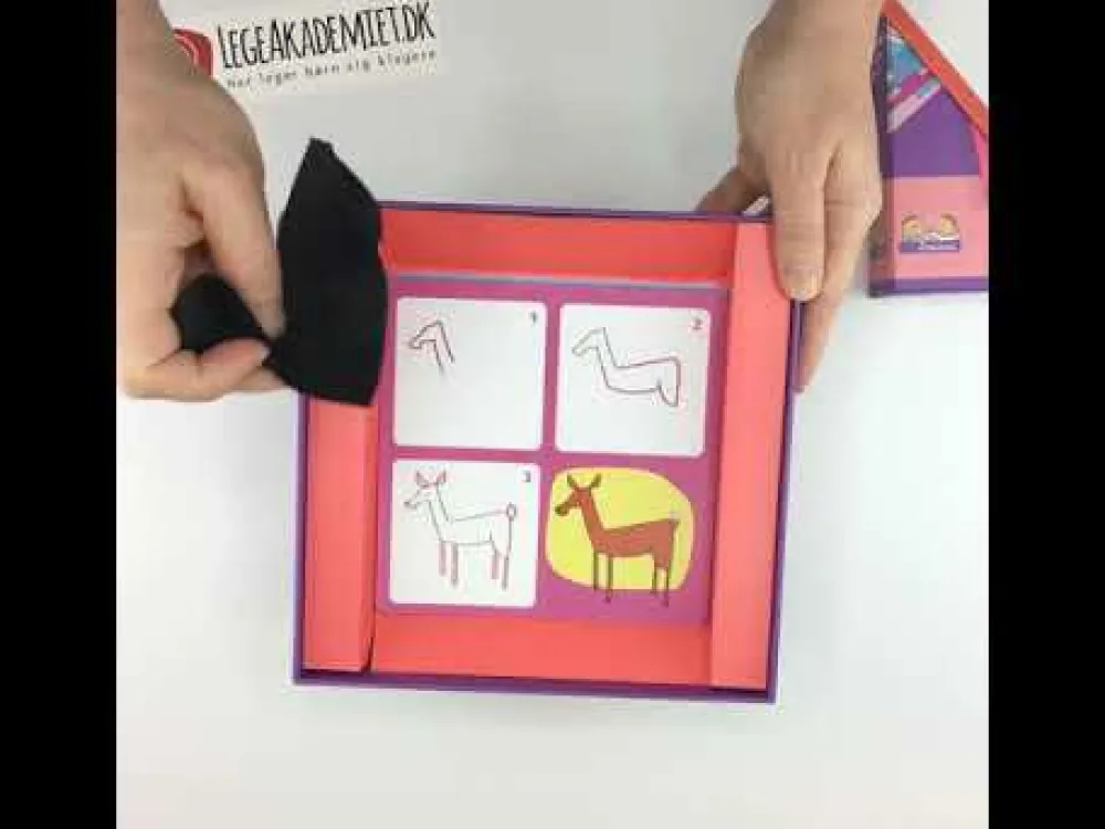 I æsken finder du en glat plade og en dry-wipe pen, så I kan tegne og viske ud igen og igen. I kan også bare bruge almindeligt papir og blyant eller tusser, hvis det der med at kunne tørre stregerne af ikke betyder så meget.