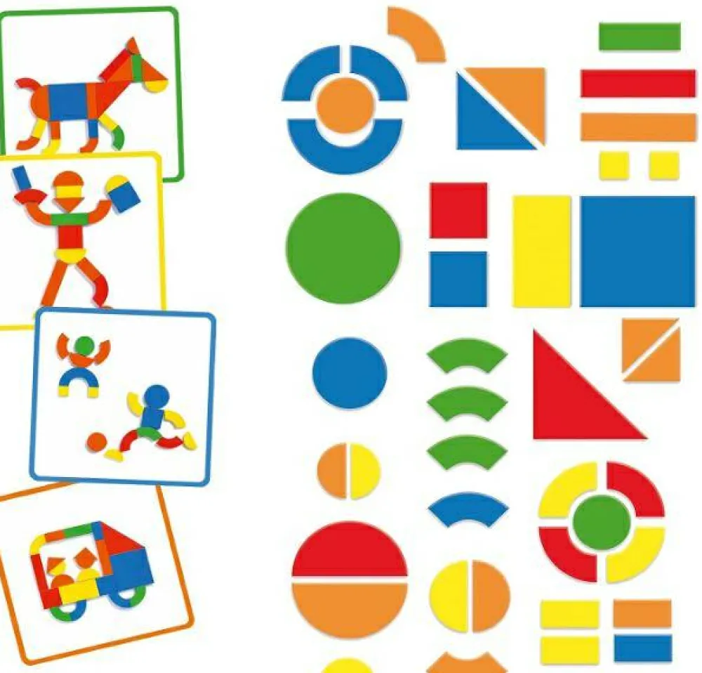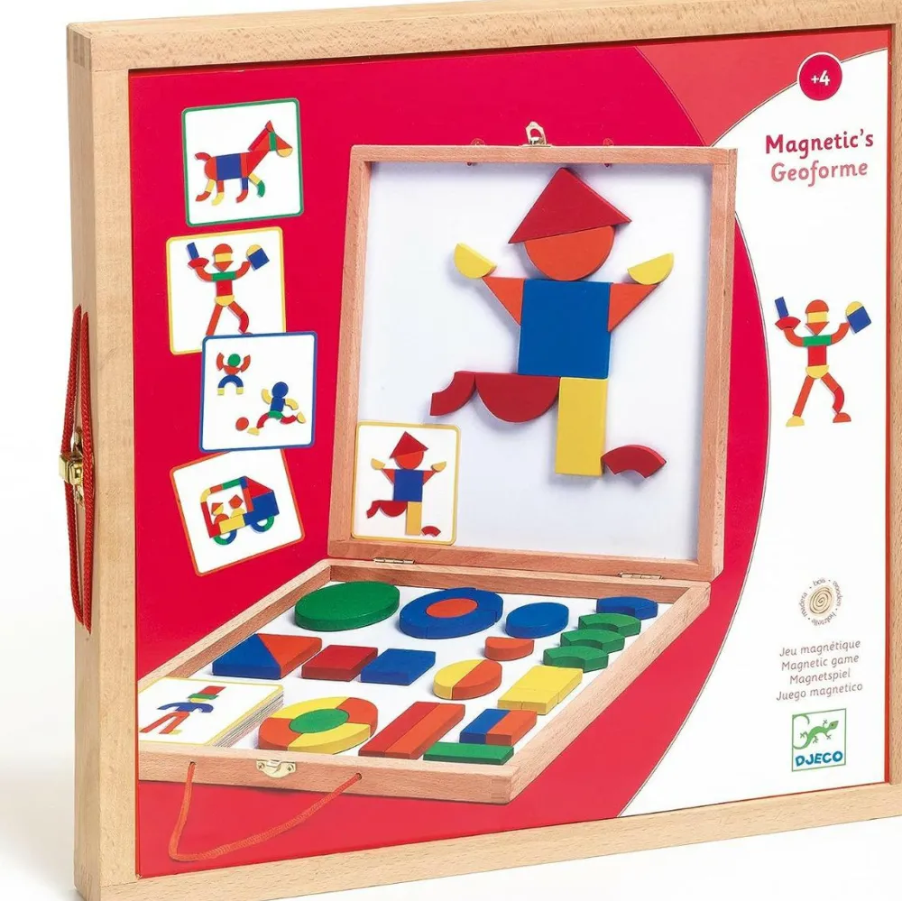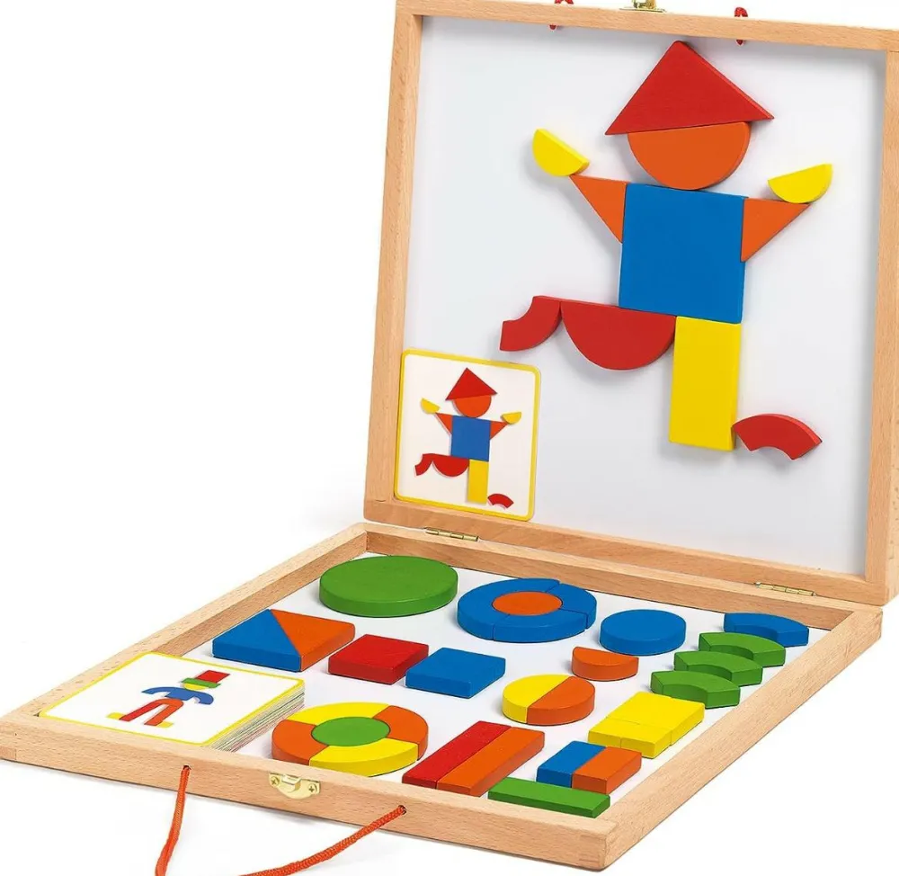 Meget fin trækuffert fuld af 42 flotte træmagneter og 24 kort med forskellige geometriske udfordringer på.