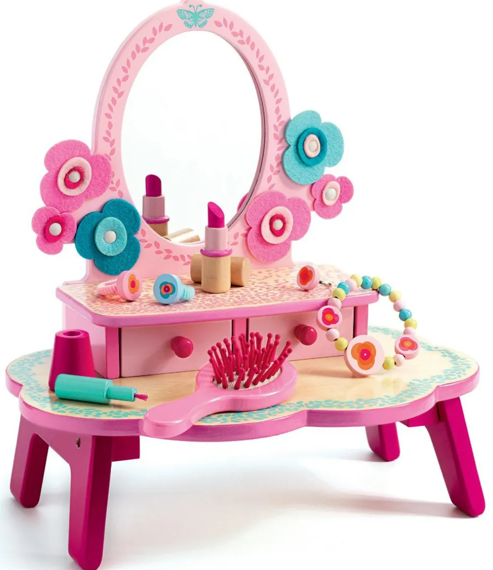 Bordet er af træ og filt i dejlige farver, og der hører masser af fint tilbehør til i form af smykker, makeup (af træ) og andet nips.