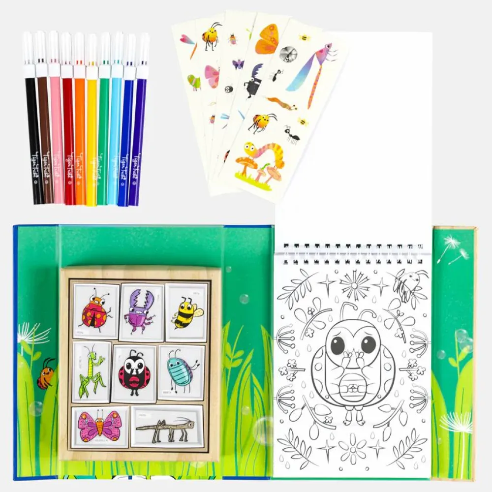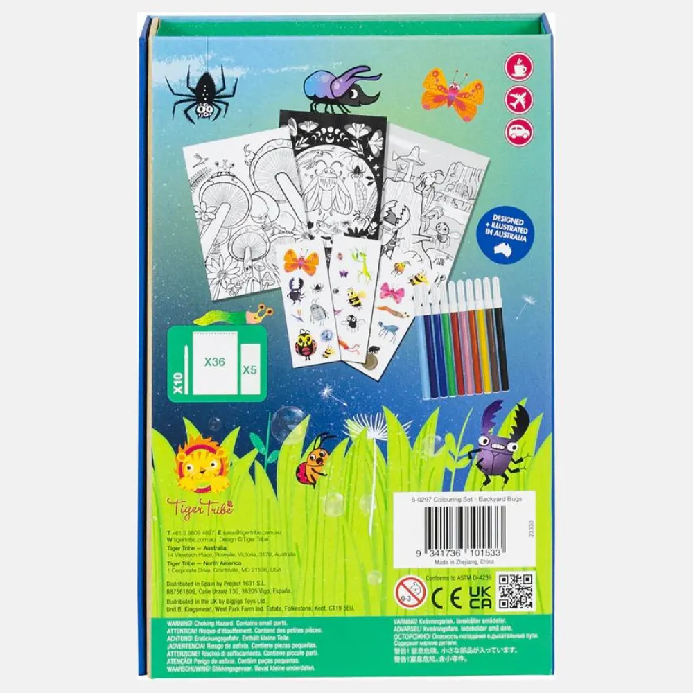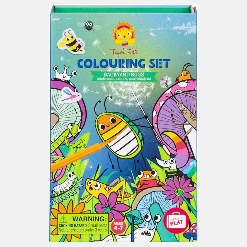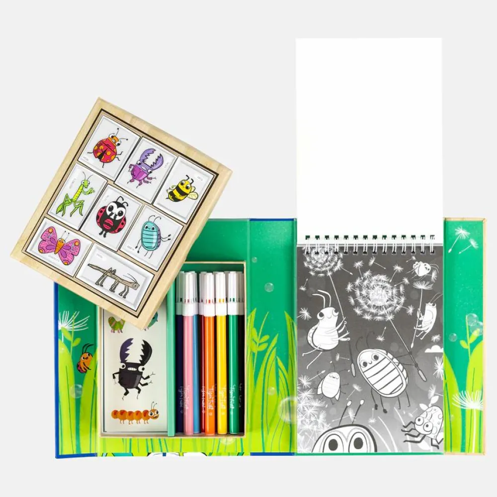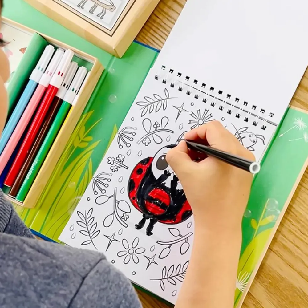 Farvelægningssæt med blok med 36 illustrerede sider (lidt som en malebog, men arkene sidder sammen i toppen og kan nemt løsnes).