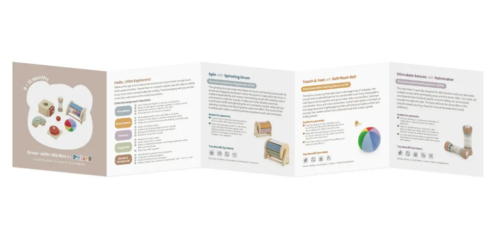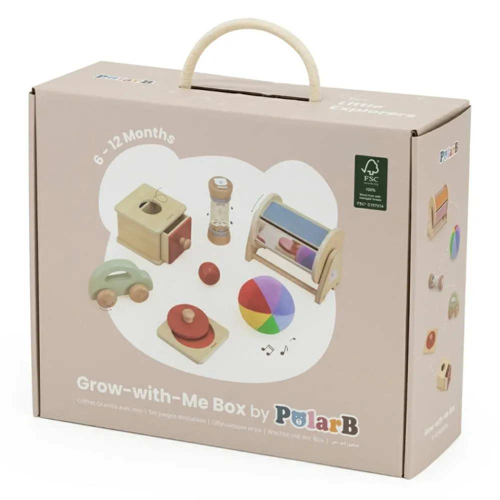 Her anbefaler vi Grow-With-Me. Det er en serie af legetøjskasser med forskellige legeredskaber, der er særligt tilpasset de udviklingstrin, børn i forskellige aldre har. Alt er af FSC-certificeret birketræ og leveres i en æske af pap med træspåner som kassefyld. Der findes Grow-With-Me kasser fra 0-3 år.