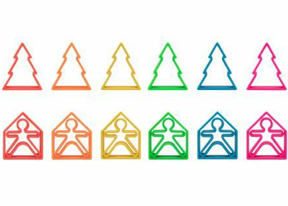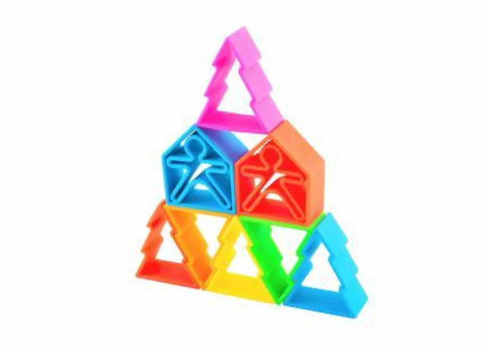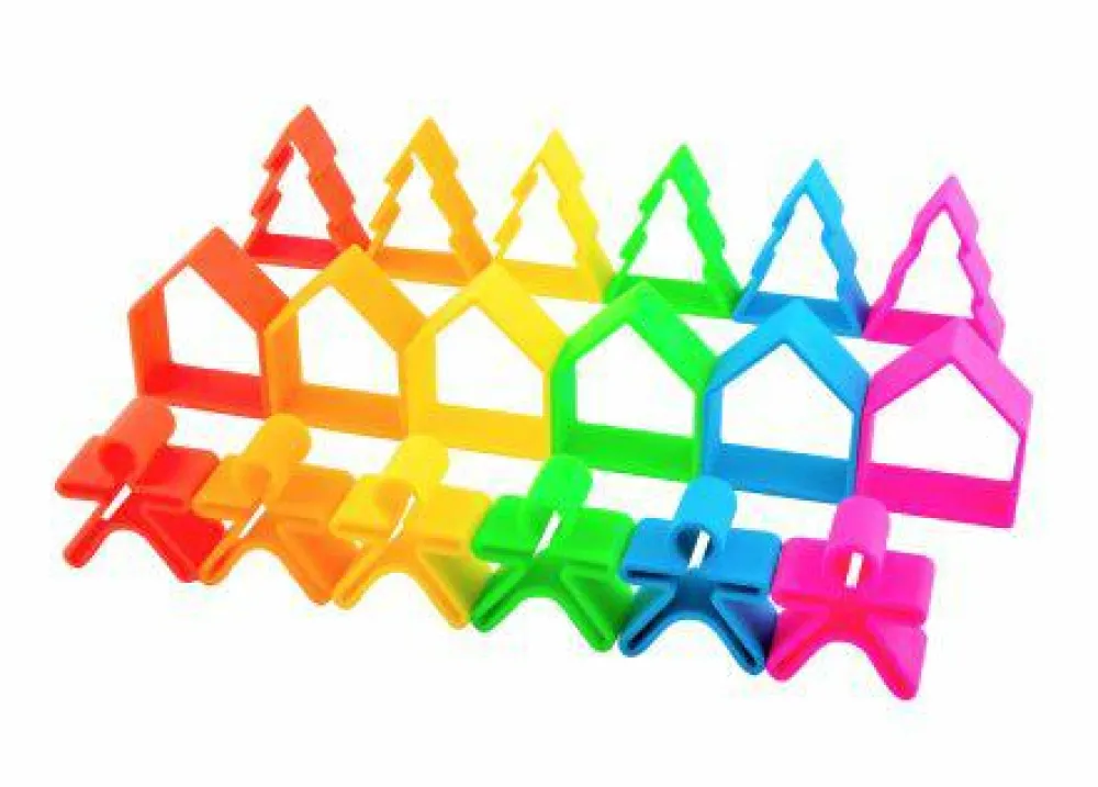 I pakken er der 18 forme. 6 huse, 6 personer og 6 træer i 6 forskellige farver.