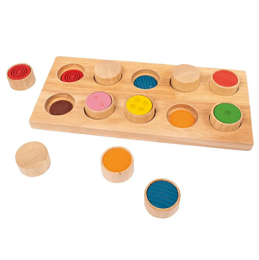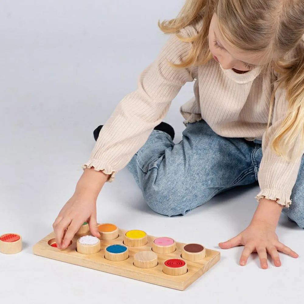 Her skal I matche de 10 runde brikker med de matchende pladser på brættet ved at løfte dem en af gangen og huske, hvad der gemmer sig nedenunder. Brikkerne og deres pladser har 10 sæt af forskellige taktile overflader og farver.