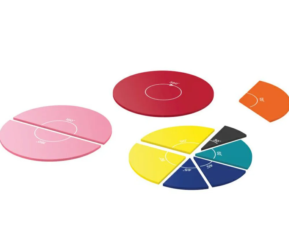 Dette sæt gør brug af samme logik fra hverdagen, men på en lidt anden måde. Her er der nemlig angivet vinkler på lagkagestykkerne. Der er 6 forskellige cirkeldiagrammer med forskellige opdelinger i halve, i 4 dele, i 8 dele og så videre. På hvert lagkage- eller pizzastykke står der et tal, der angiver vinklens værdi. Fx 360 grader på den hele cirkel og 90 på den kvarte.