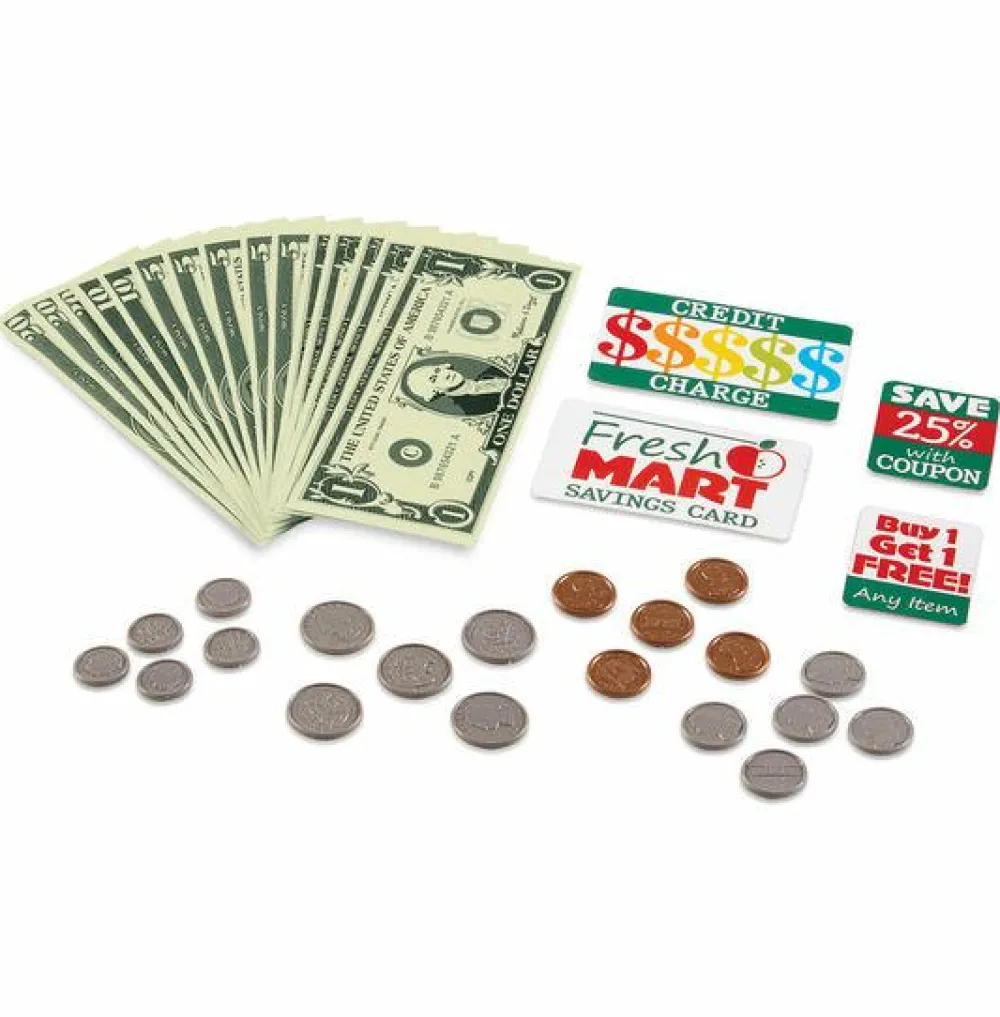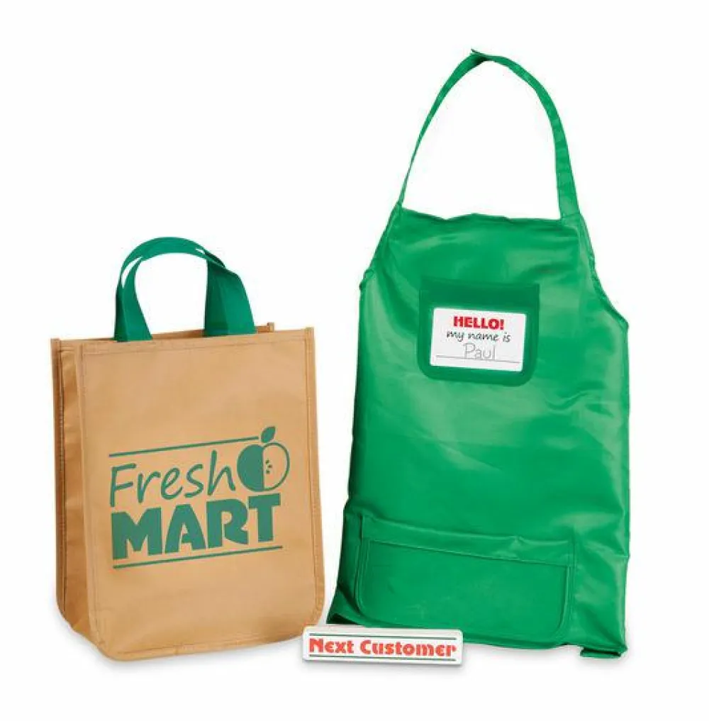 - Udklædningsdele med forklæde, indkøbspose, legepenge, kreditkort og rabatkupon’er