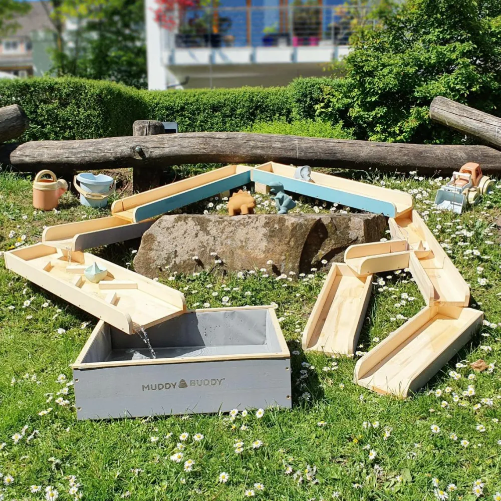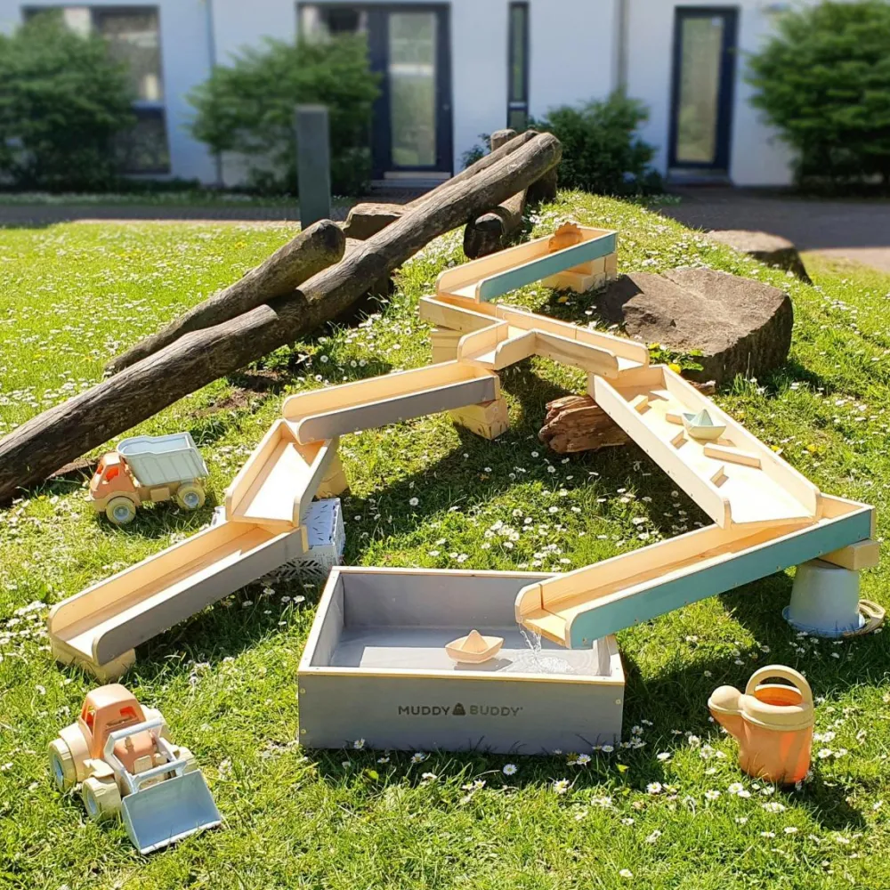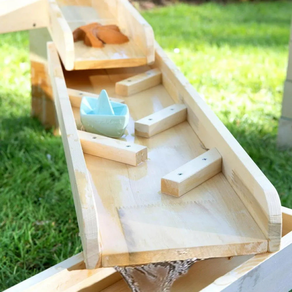 MUDDY BUDDY® udendørs legeudstyr er fremstillet af massivt cyprestræ, som har fået træbehandling. Denne vandbane kræver ekstra træbeskyttelse for at beskytte træet.
