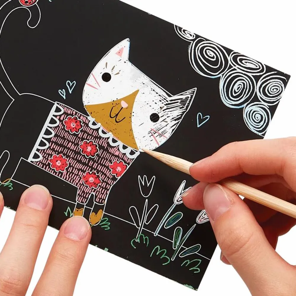 De fire af kortene har motiver med sjove og legesyge katte, som dit barn kan få frem med træpennen. De to sidste kort har regnbuefarvet baggrund, hvor dit barn kan skrabe og selv finde på mønstre eller kreationer efter fri fantasi.