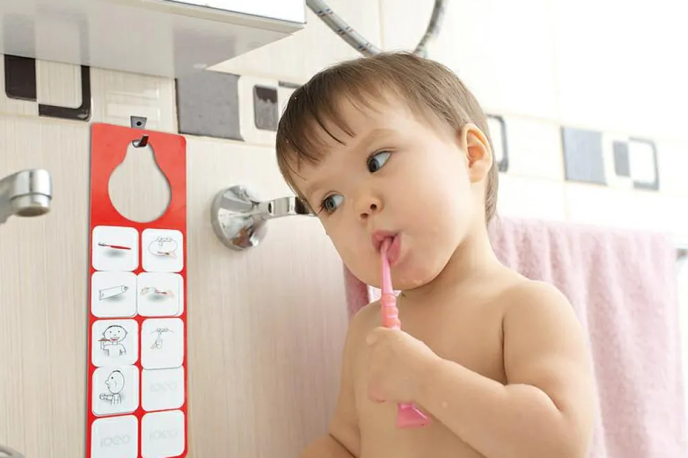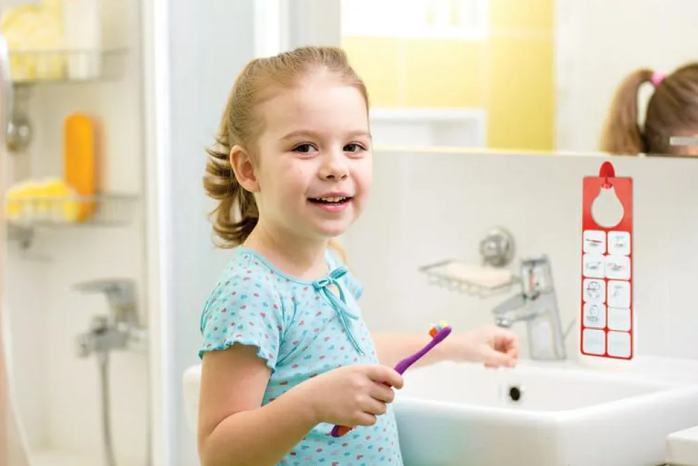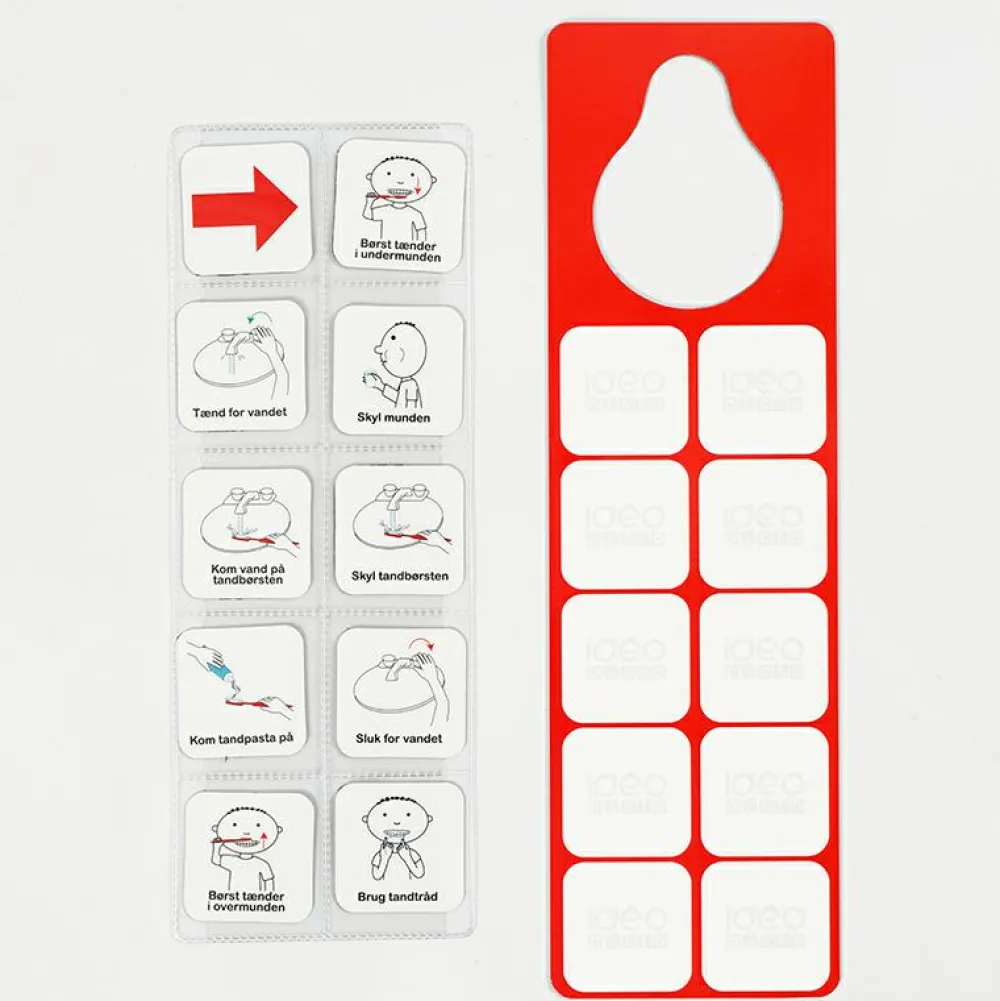 Med piktogrammer der kan hænges på en krog eller et håndtag eller sættes fast på spejl eller fliser ved hjælp af den medfølgende sugekop.