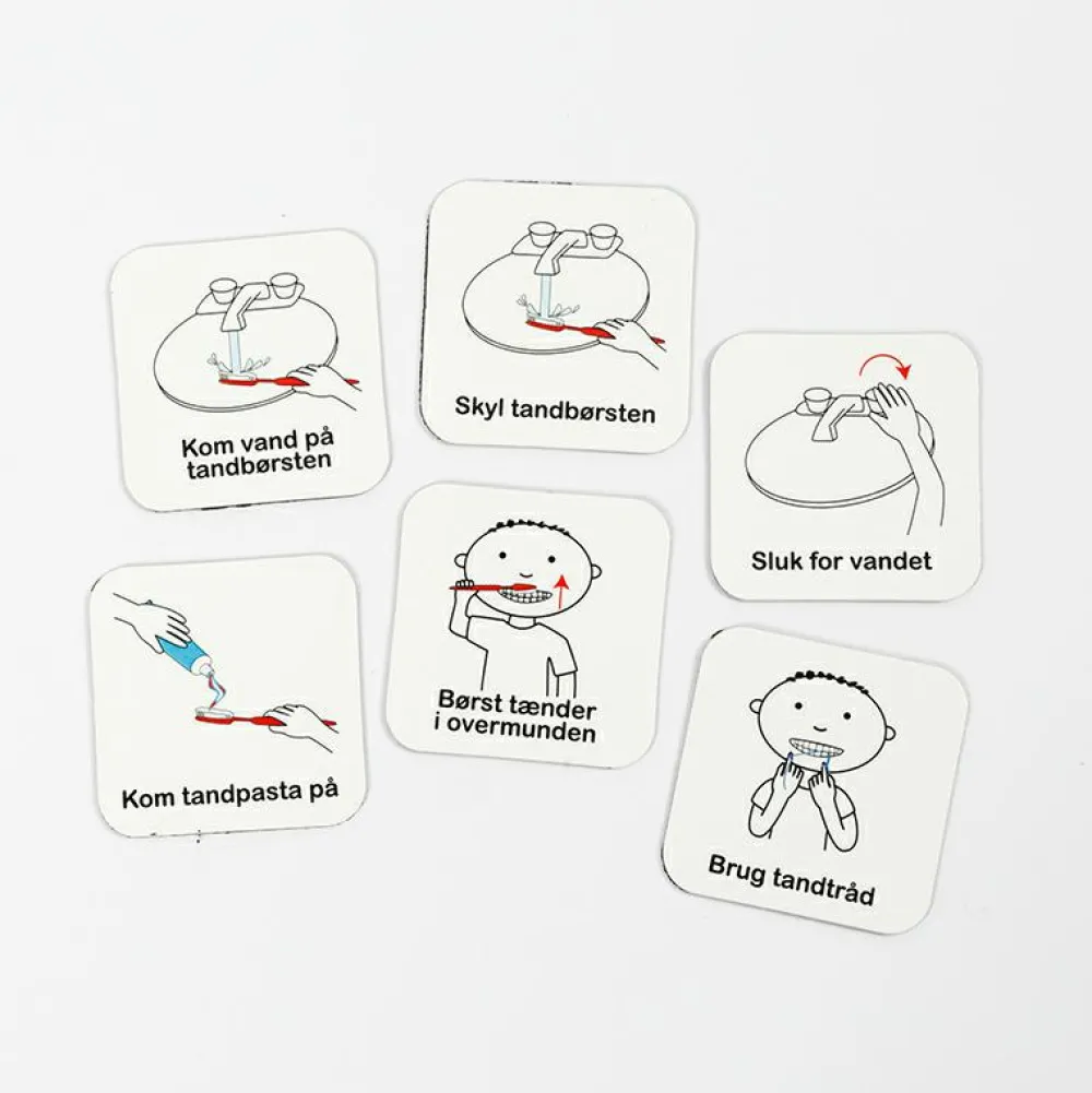 Meget praktisk piktogramserie til at lære hele familien at børste tænder, så de bliver helt rene. Her er 10 letforståelige piktogrammer med dansk tekst, der viser alle 10 trin i at børste tænder.
