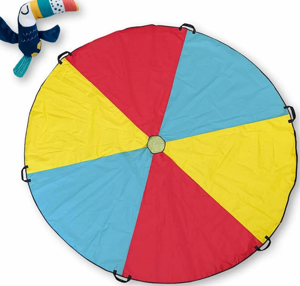 I midten har faldskærmen et hul med net for, så I også kan lege med at lade små lette bolde danse rundt i faldskærmen, uden at de kan hoppe ud i midten.