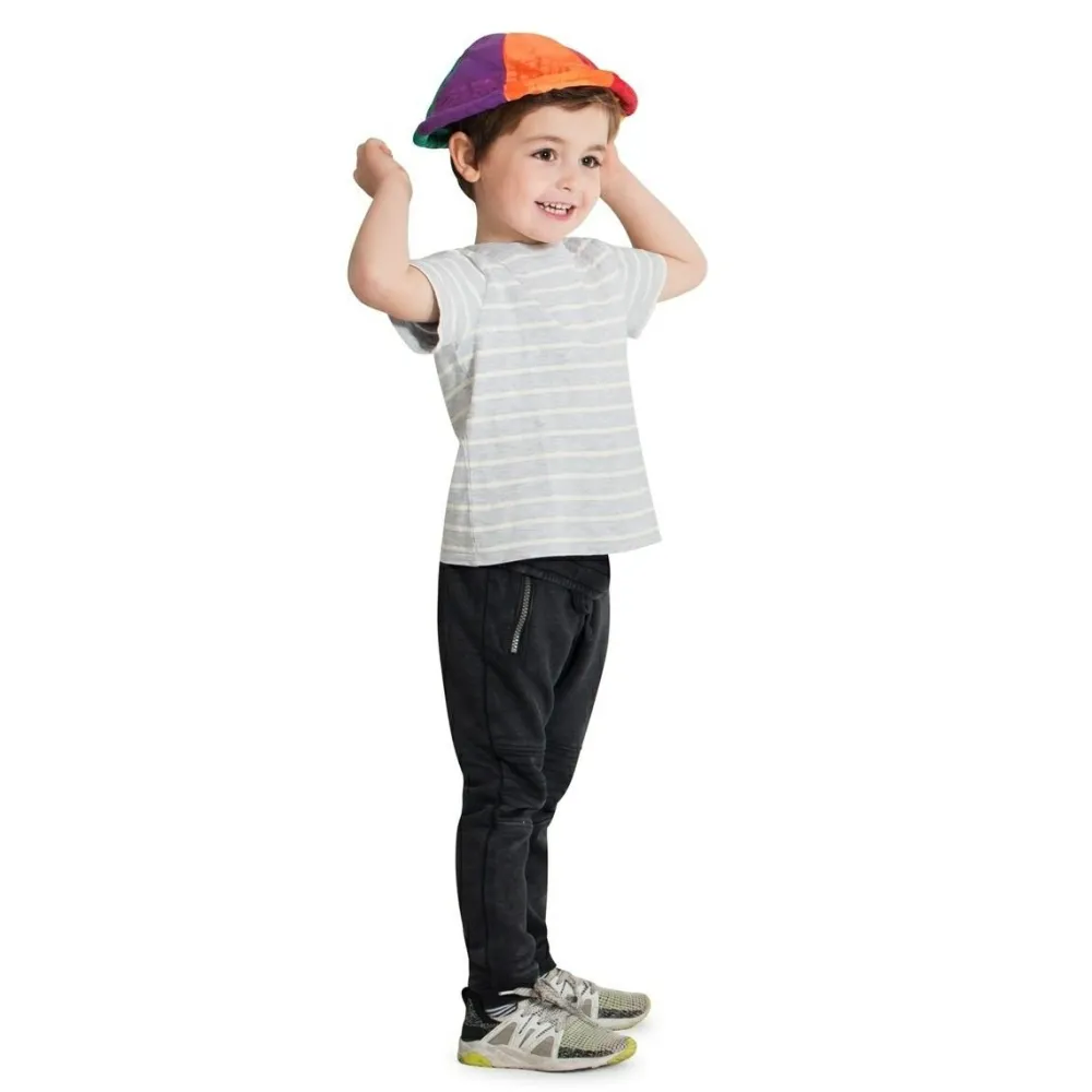 Farverig frisbee i stof. Den er nem at kaste og gribe sammenlignet med klassiske hårde frisbees. Og så har den tilmed det ekstra sjove element, at det er muligt at gribe den med hovedet.
