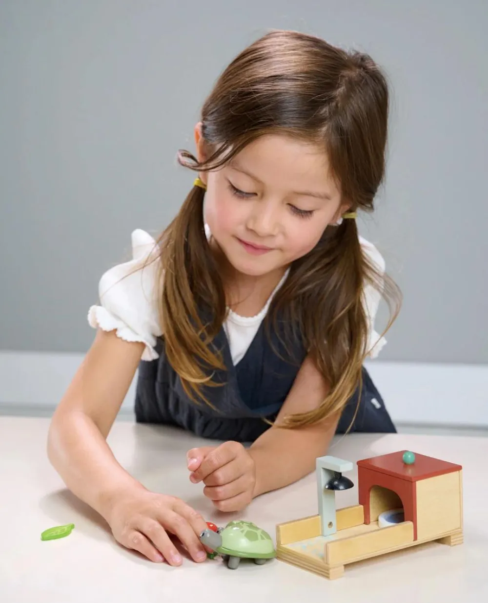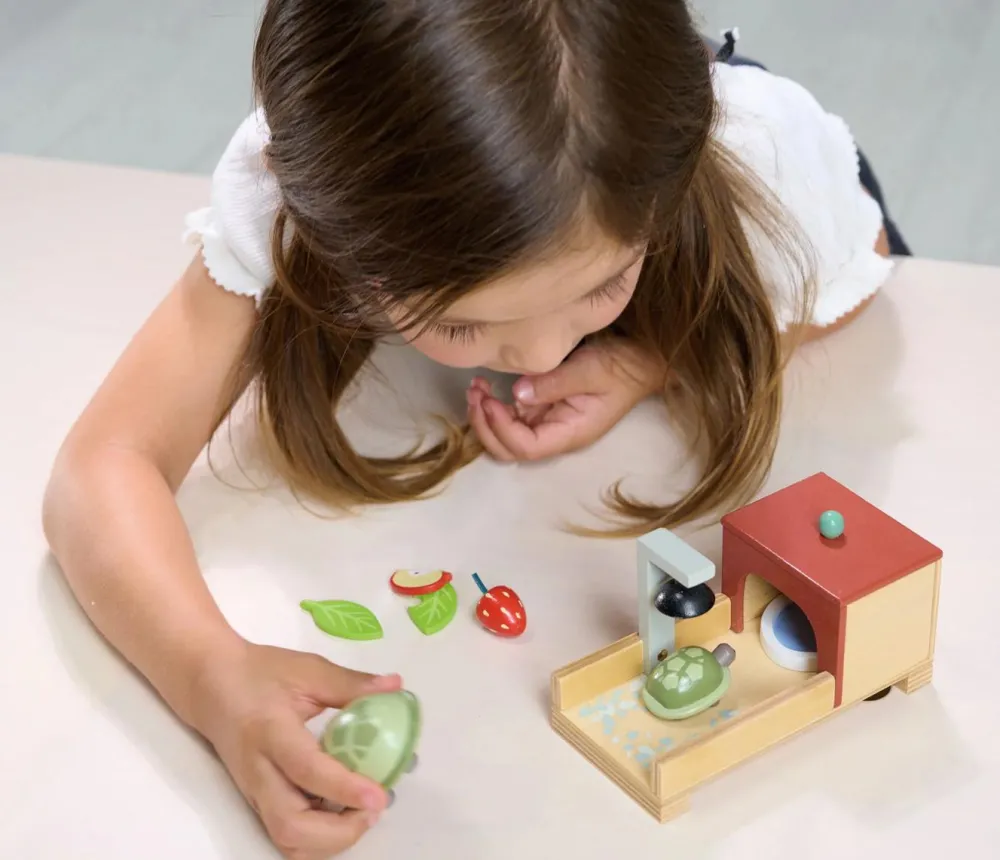 Inkluderet i dette sæt er 2 skildpadder, et skildpaddehjem, en vandskål, to blade, en skive æble og et jordbær.