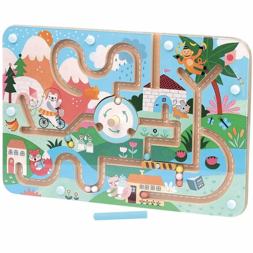 Fang en kugle med den magnetiske tryllestav. Med den kan du føre kuglen rundt gennem hele labyrinten. Skal den ned i husest allernederst eller helt op i bjergene? Måske skal hjulet i midten drejes, inden kuglen kan nå helt frem.