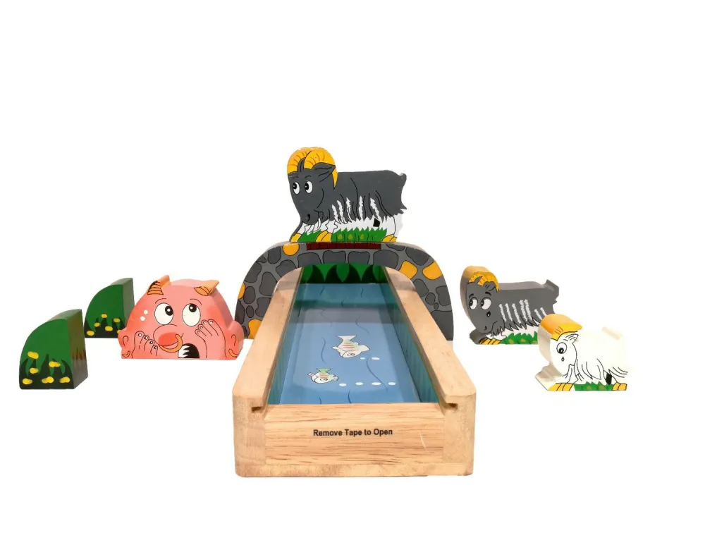 Dette fine sæt har klodser formet som broen, trolden, de 3 bukke bruse og en græstot, som skal illustrere sæteren – altså den græseng, hvor de 3 bukke bruse skal over for at spise sig tykke og fede efter en lang vinter og en sulten vår.