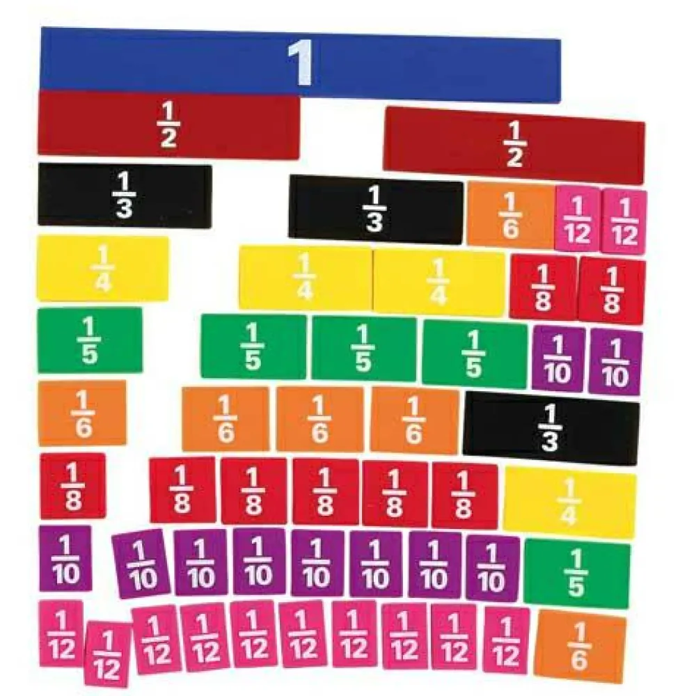 Hver brøk har sin egen farve og bliver leveret i en plastramme, som man fordel kan bruge, når man skal vise den ene brøk overfor den anden.
