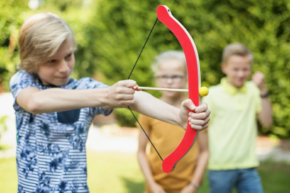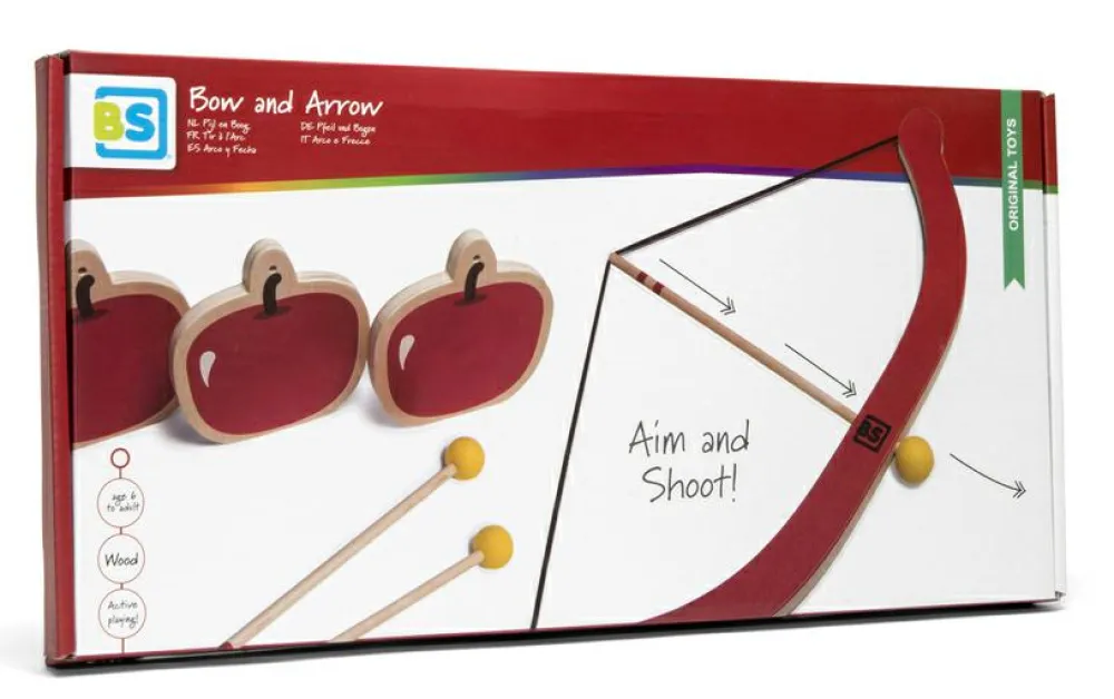 Pløk æblerne ned og træn din hånd-øjekoordination med dette børnesikre sæt med bue, 3 pile og 3 æbler af træ.