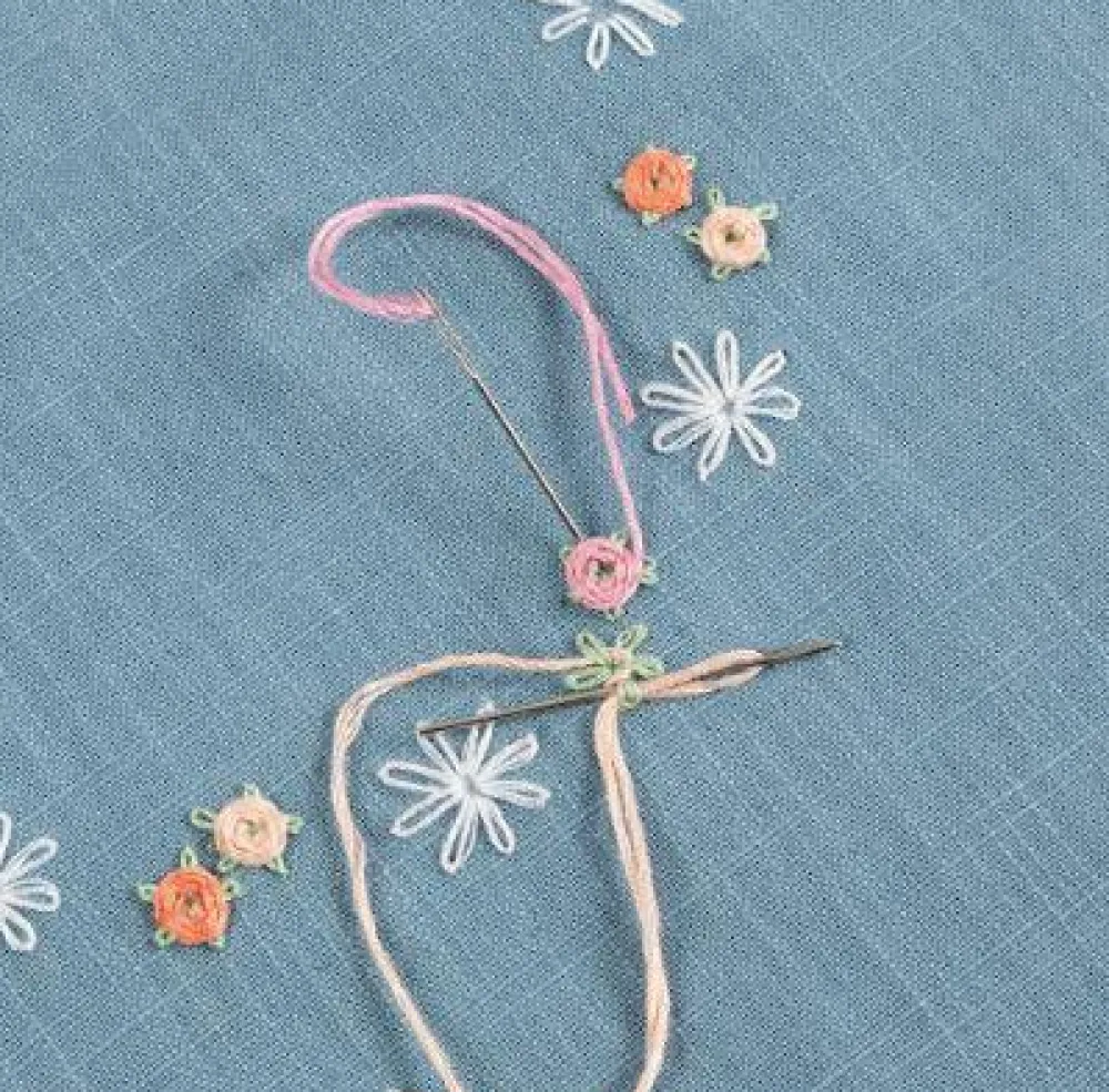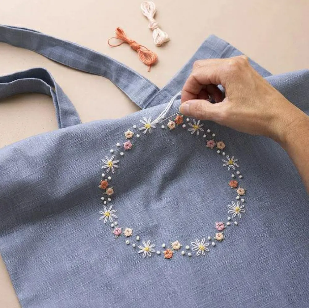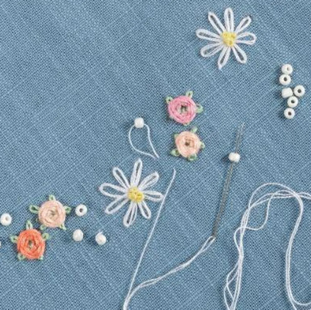 Sættet indeholder stofpose, nål, broderigarn, perler, og en smart nåletråder.