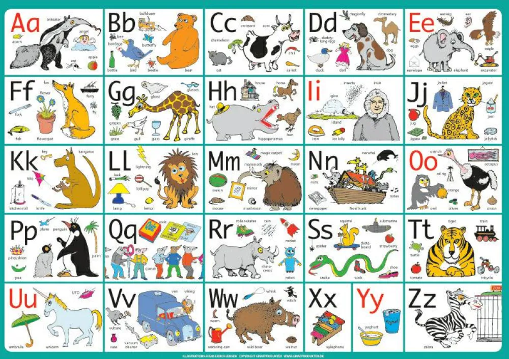 Hvert bogstav er farvekodet om det er en vokal eller konsonant, og du har mange forskellige tegninger af dyr eller ting, der starter med bogstavet.