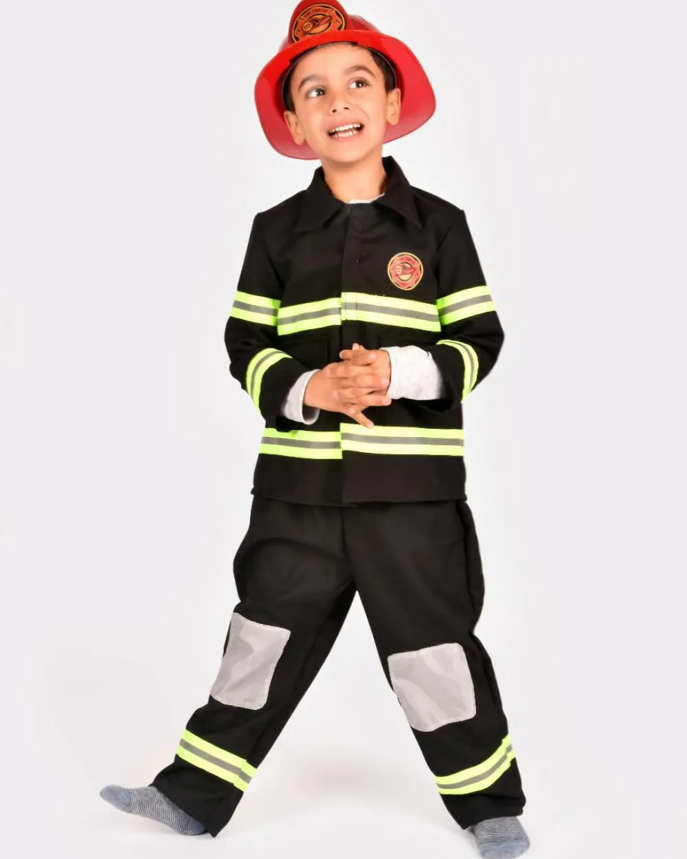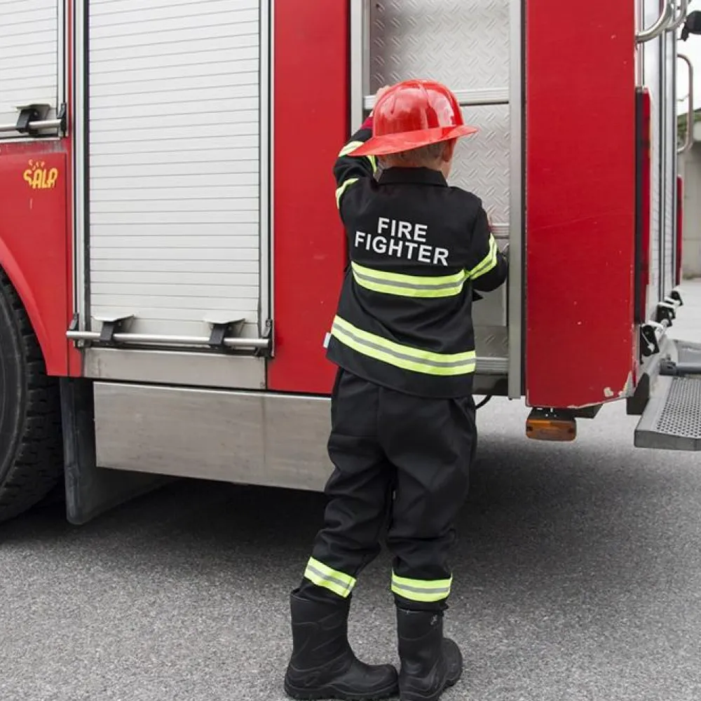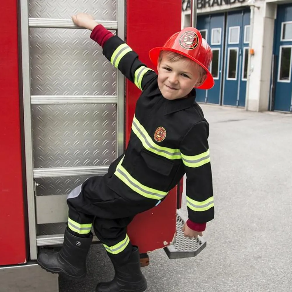 Fint brandbekæmperkostume med jakke, bukser og hjelm af plastik.
