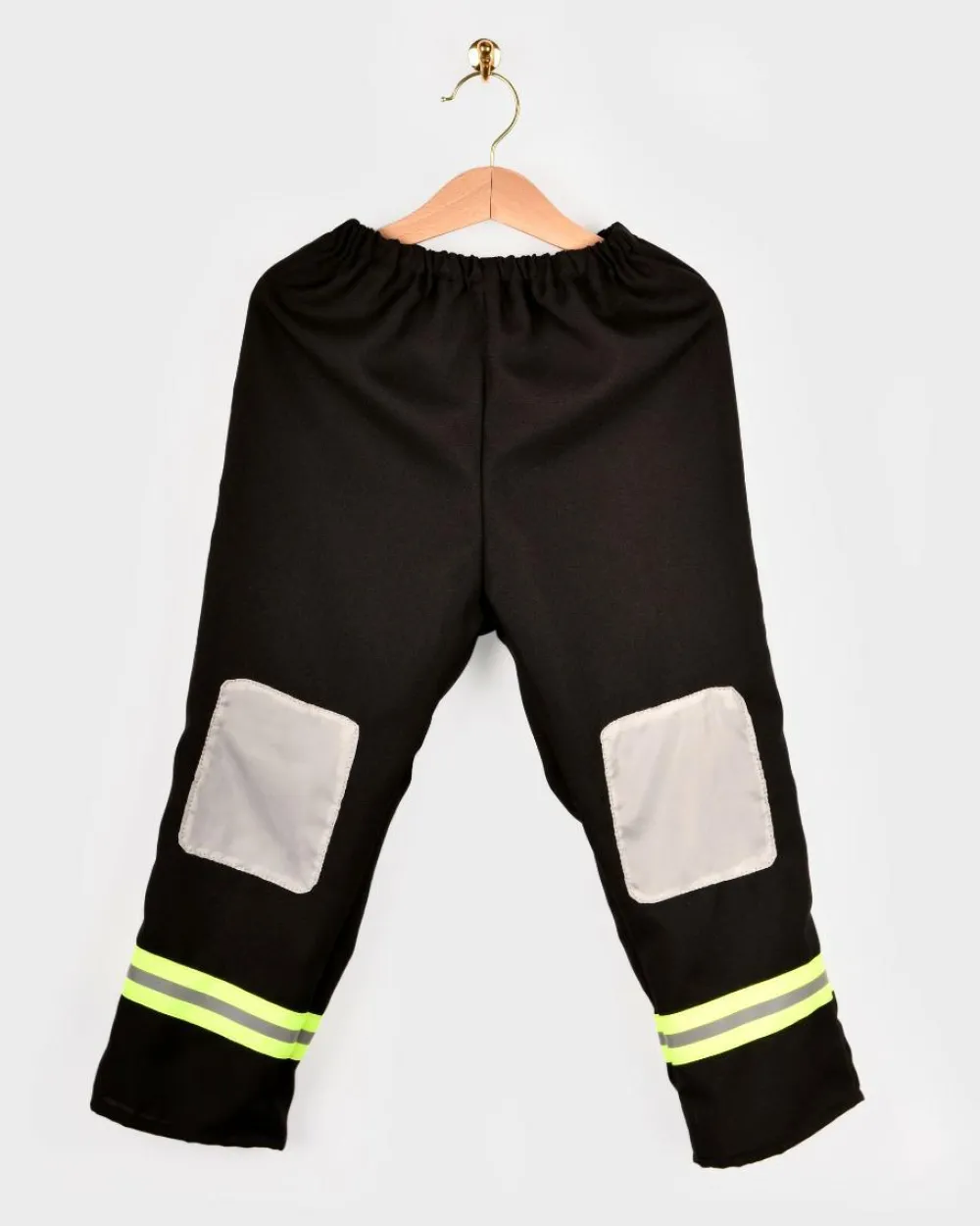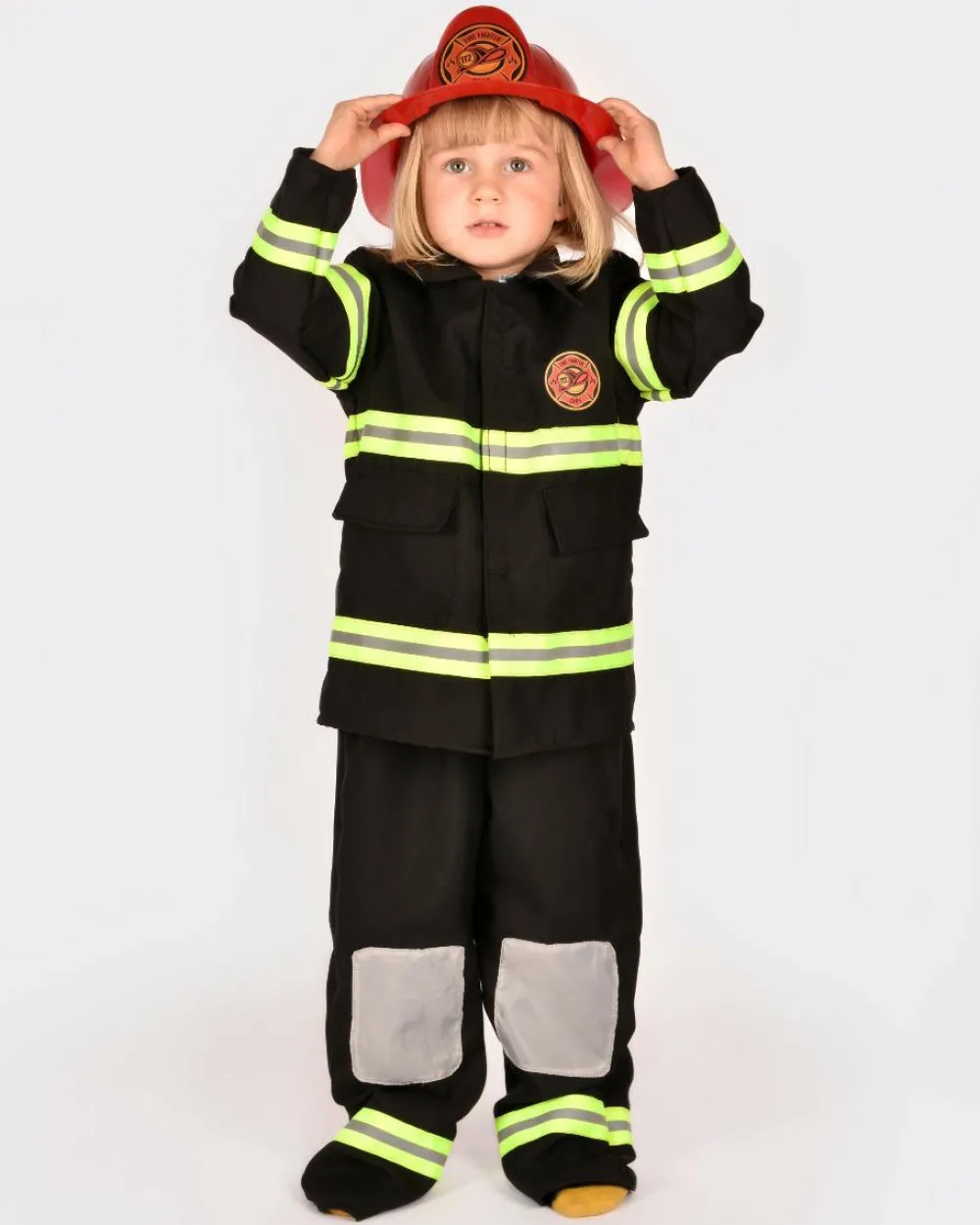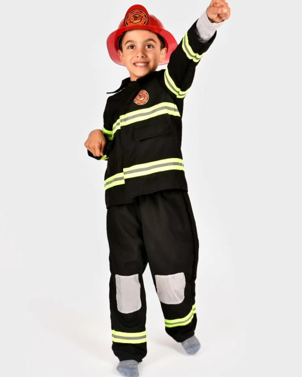 Fint brandbekæmperkostume med jakke, bukser og hjelm af plastik.