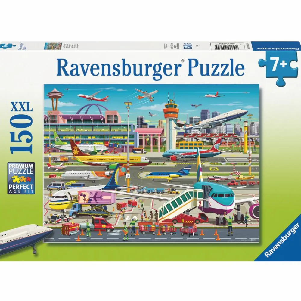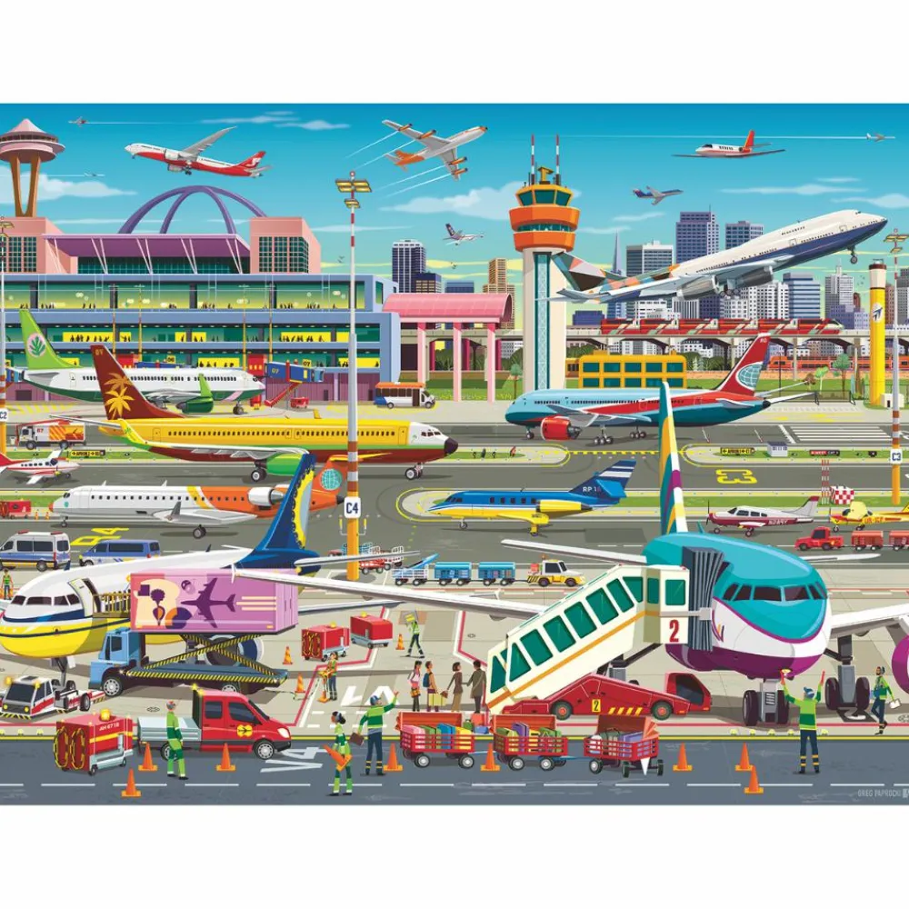 Stort puslespil fuld af de travle og fascinerende gøremål i en lufthavn.