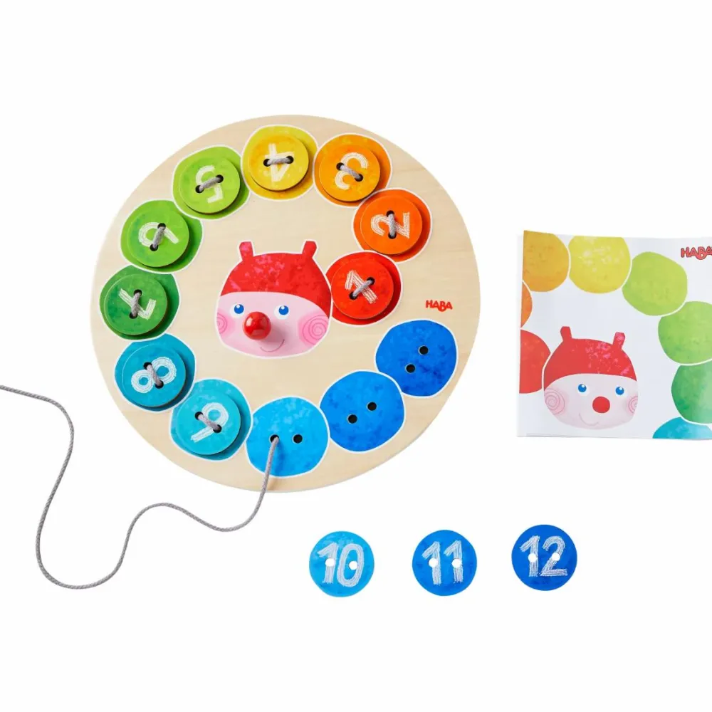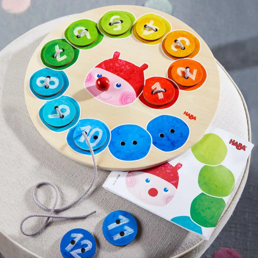 Dit barn kan enten følge anvisningerne i det lille hæfte eller selv finde på farvekombinationer, når de store knapper skal “sys” på larven.