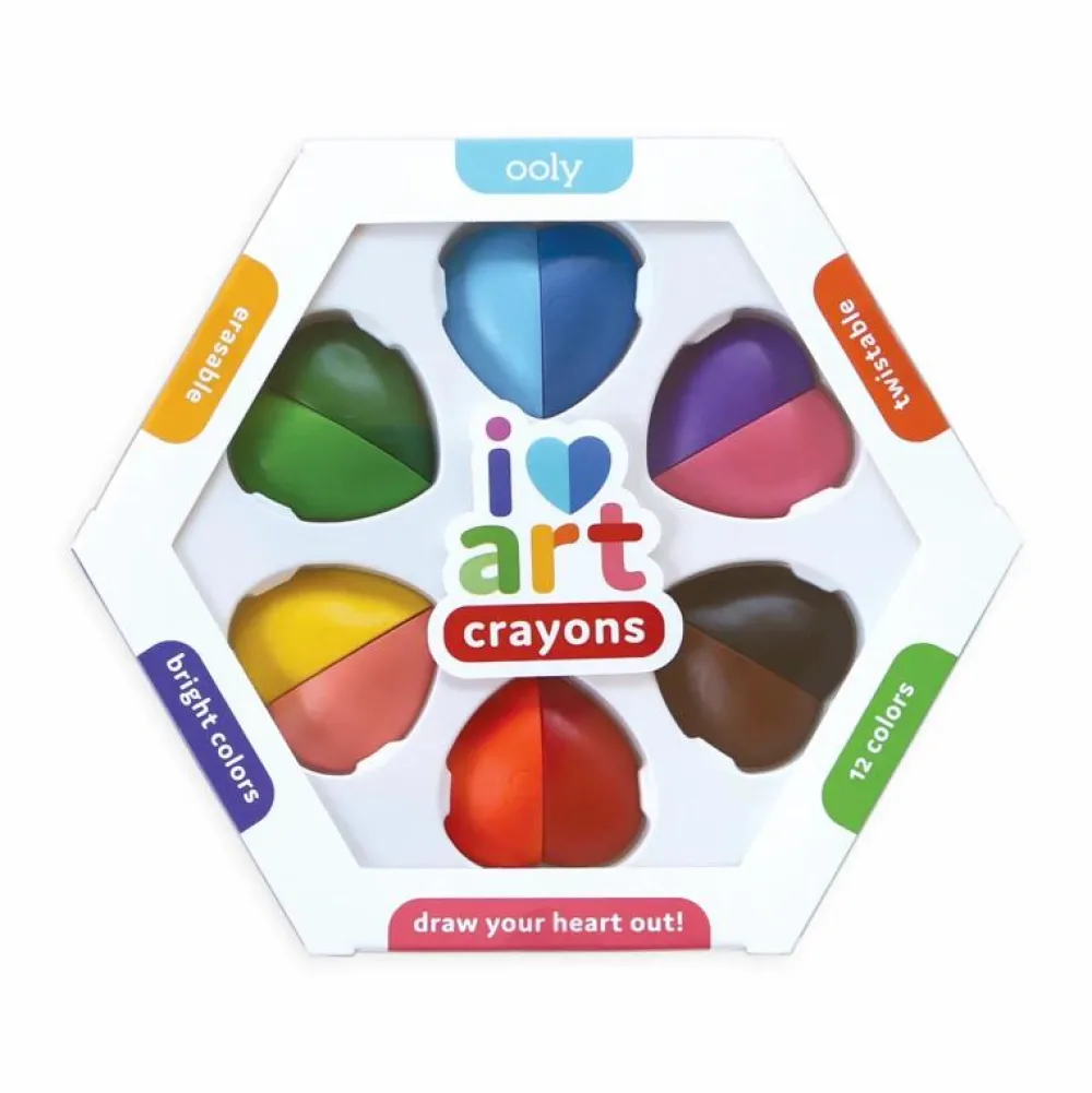 Disse fine hjerteformede og kulørte farvekridt kan du viske ud igen. Perfekt til små perfektionistiske kunstnere, eller hvis farverne røg uden for stregerne i malebogen eller på påklædningsdukken. Og genialt, hvis du lige smurte en mad eller satte en vask over og kom tilbage til nye kunstværker på stuevæggen ca. 60 cm over gulvhøjde.