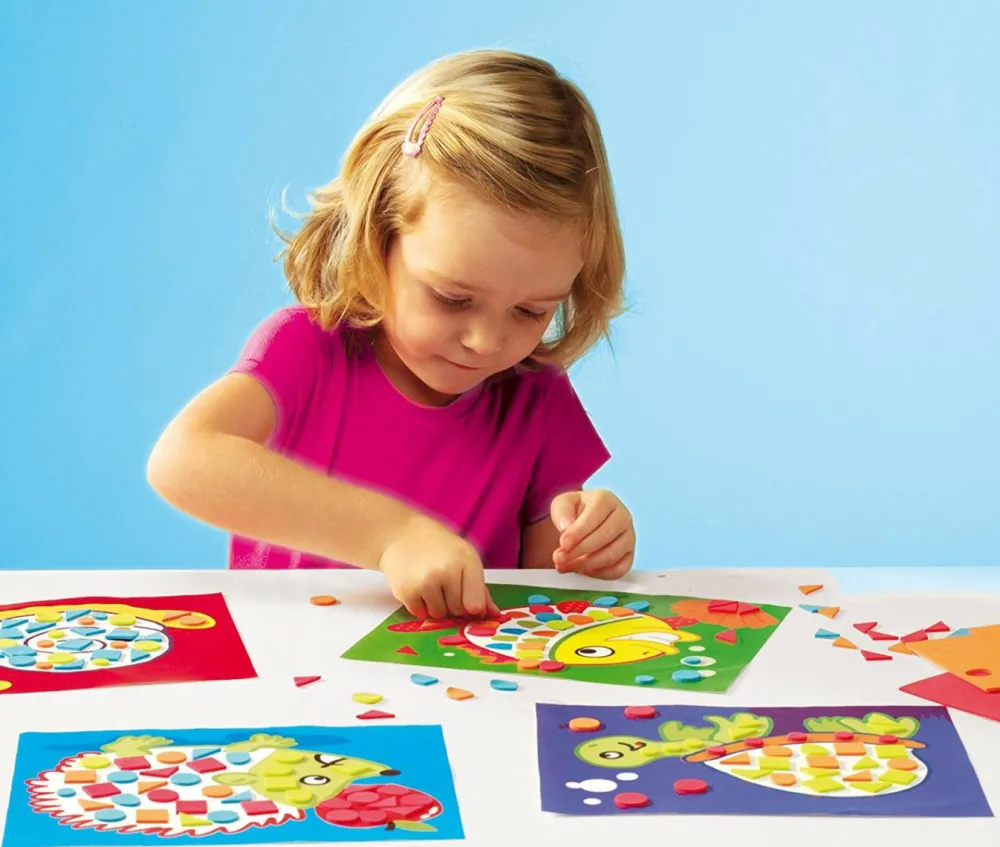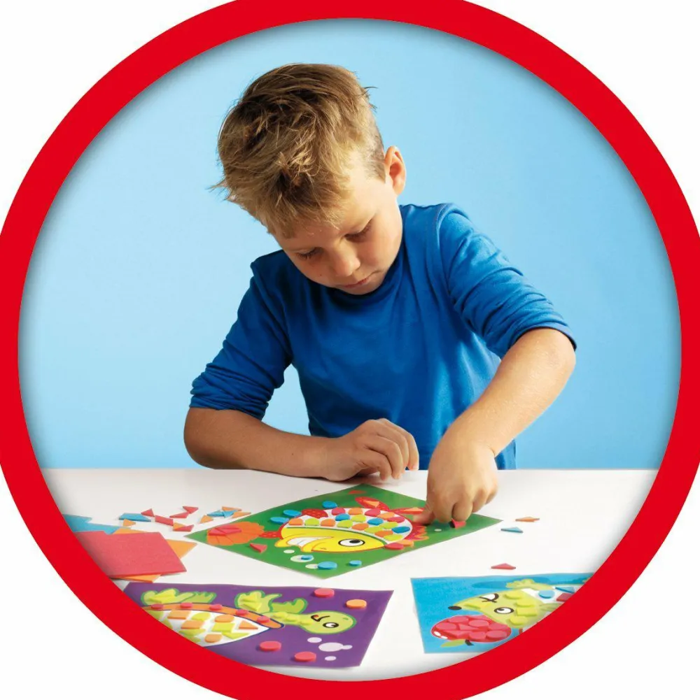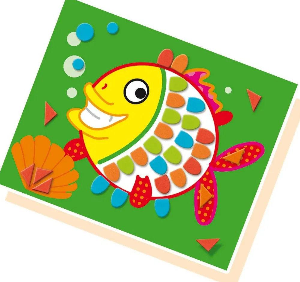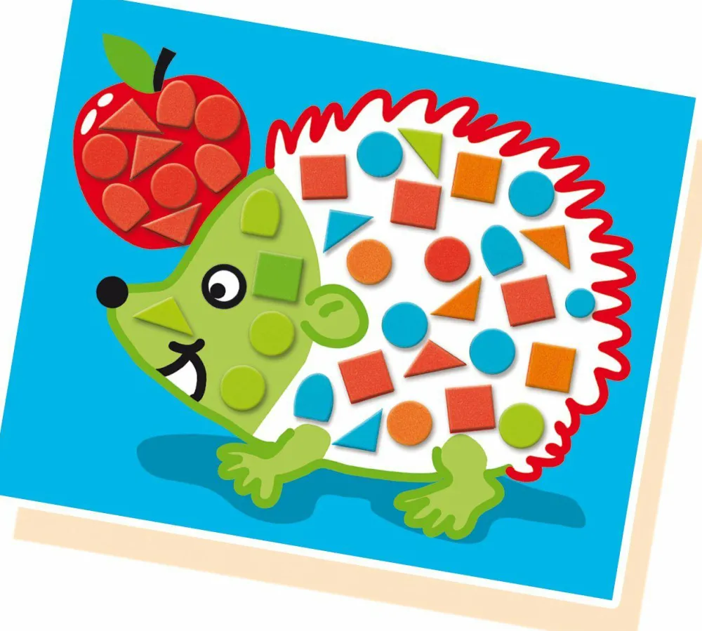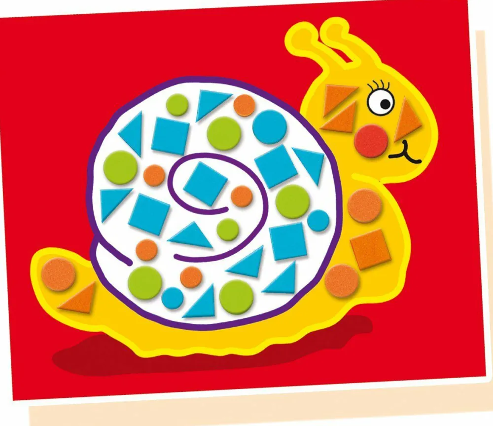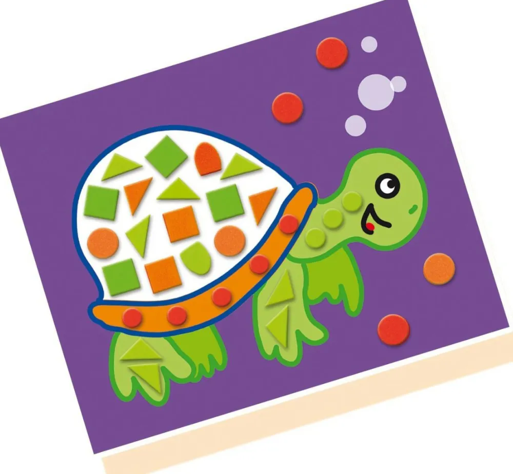 Dit barn kan her lave skønne og farverige mosaikker, uden brug af hammer og ituslået keramik. Åben æsken og legen med former og farver kan gå i gang. En leg med fordybelse i klare farver og glade motiver, og giver for de fleste et flot resultat.