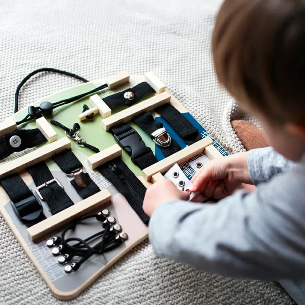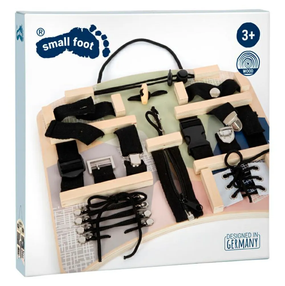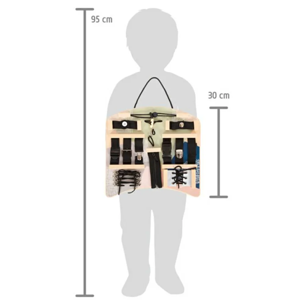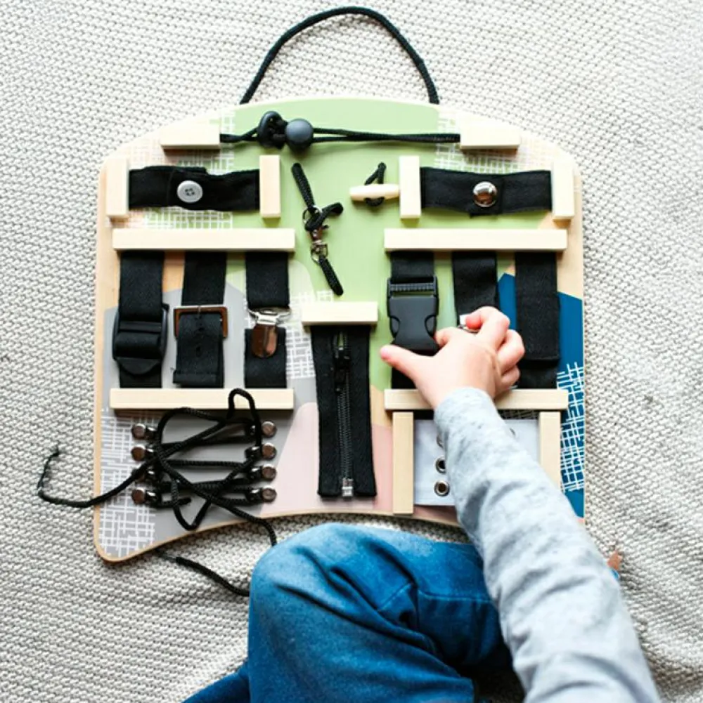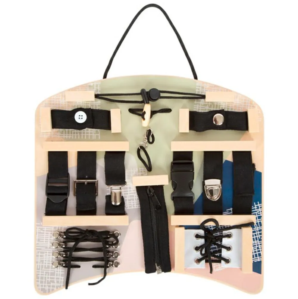 På denne finmotorisktavle er der 14 forskellige lukkemekanismer. Når dit barn mestrer dem, er det ingen sag selv at tage tøj på.
