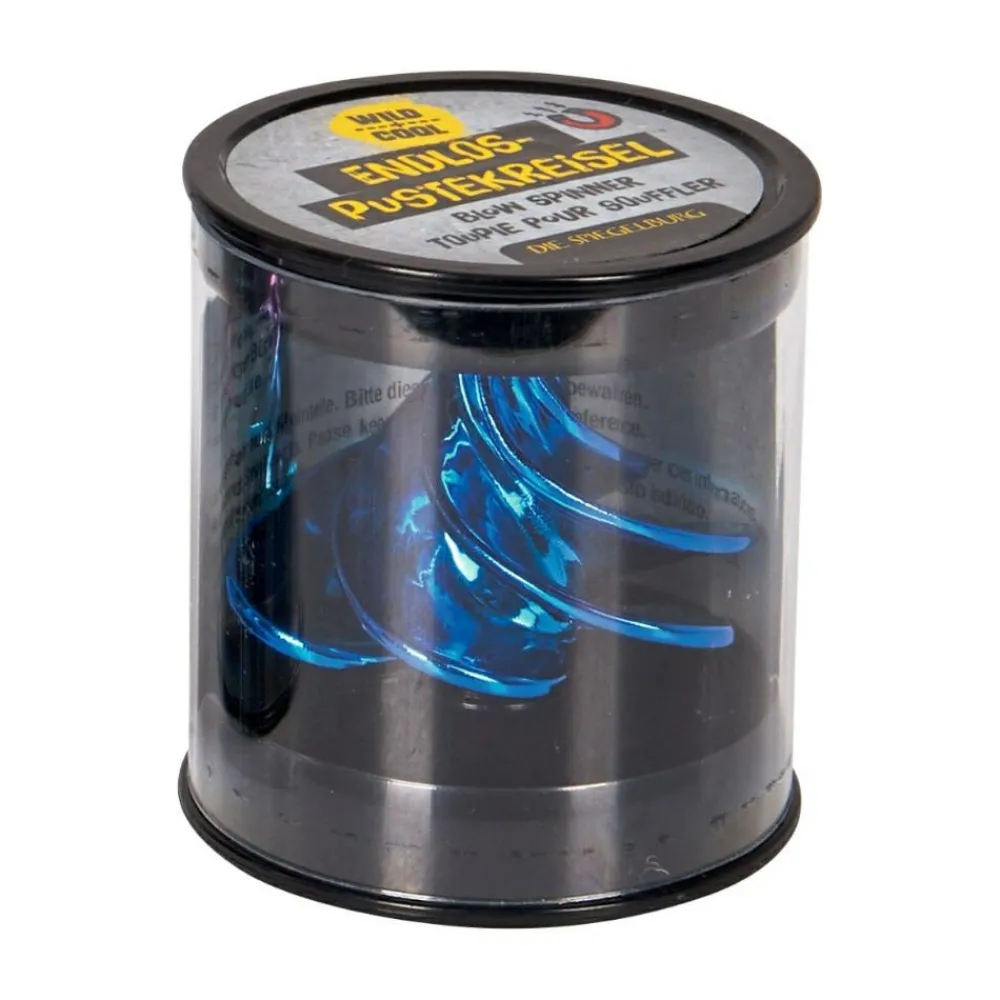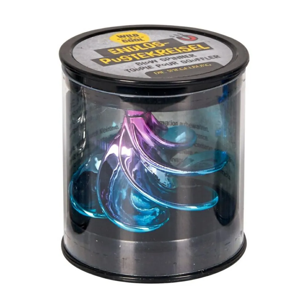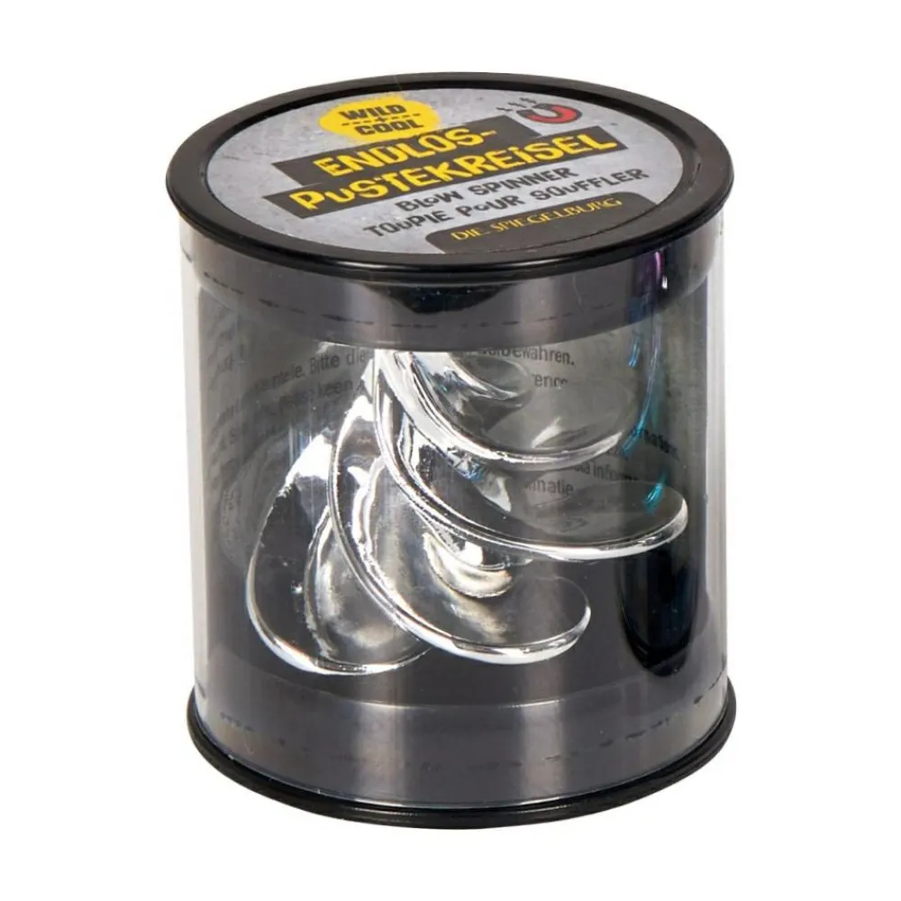 En pustesnurretop. Ja den er god nok. Vend beholderen og sæt snurretoppen på bunden. Der kan den snurre ved at du puster til den – og blive ved så længe du orker at holde den igang.
