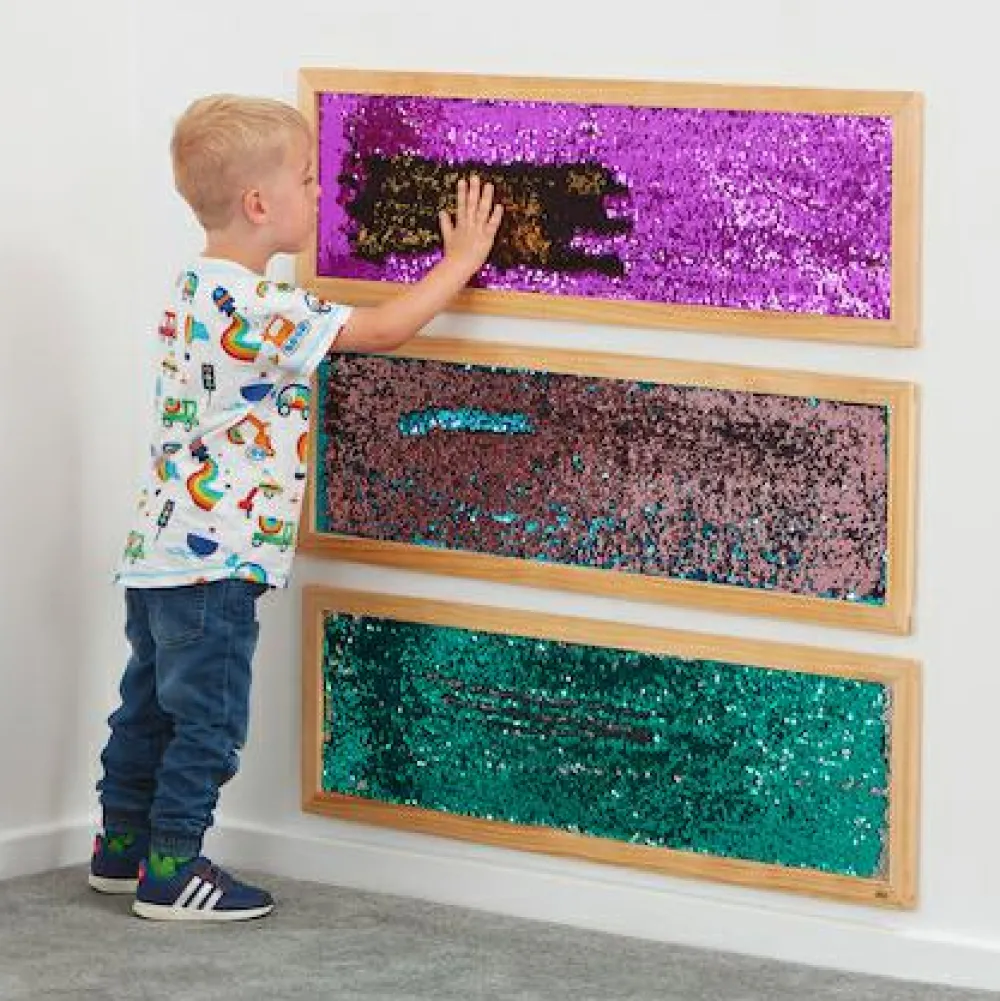 Vægpanelet på 1 meter kan både hænges op vandret eller lodret, så ungerne eventuelt må op på tå for at nå de øverste pailetter.
