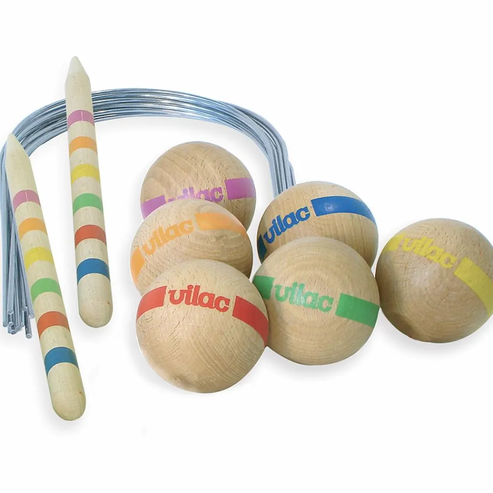 Klassisk kroketspil til haven, hvor det er muligt for 6 personer at deltage. Lav en bane på græsplænen med de 10 buer, vælg farver, og så er I klar til et spil.