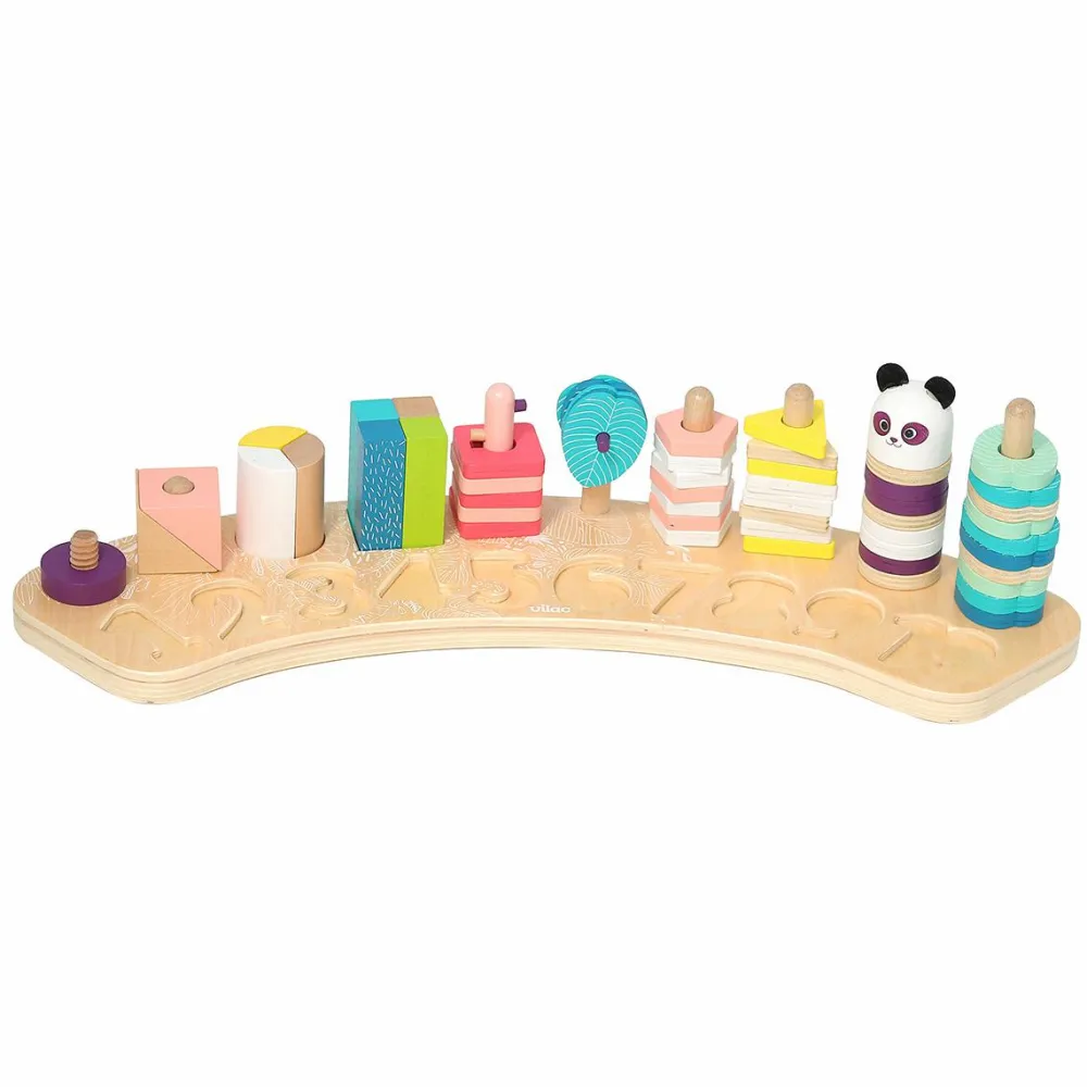 Super fint stablebræt, hvor det regelrette barn kan stable og sortere alle klodserne, så de passer til mængderne på brættet. Eller hvor dit barn kan se stort på, hvad der måske er “meningen” og i stedet bygge fantasiskabninger, stable det højeste tårn og se, om det lille hjul kan vælte stablen, hvis man triller det afsted med god fart.