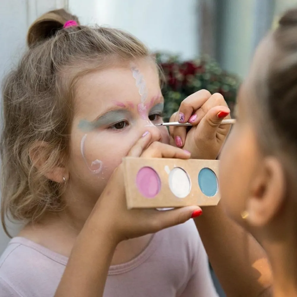 Godt lille, praktisk sæt med lilla, turkis og hvis ansigtsmaling, som du kan bruge til at forvandle et barn eller dig selv til en flot prinsesse, enhjørning eller måske en blomst eller turkisblå dinosaur. (Eller du kan i hvert fald gøre forsøget).