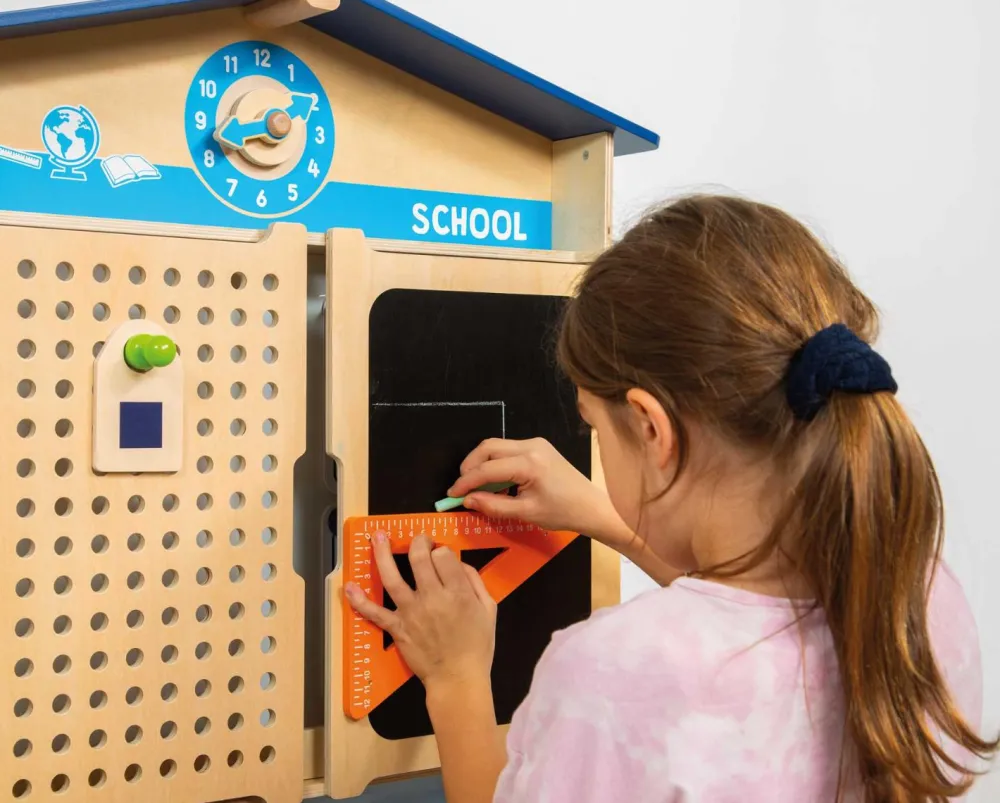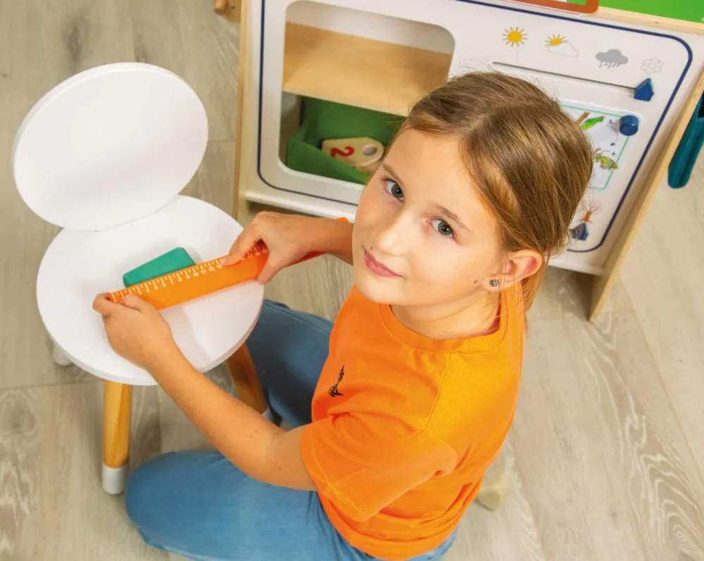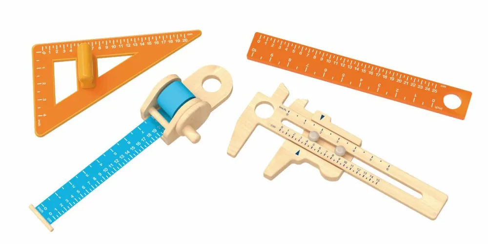 Her får dit barn både lineal, skydelære, målebånd ogmåletrekant, så alt fra den nærmeste frugt til din lillefinger og bamses livvidde kan blive målt op.