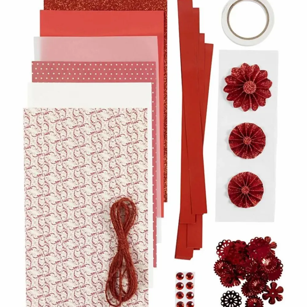 Alt du skal bruge af mønstret, glitret og ensfarvet papir, papirstrimler, pailetter, rosetter, bånd og snor, tape, rhinsten og skabeloner til hyggelig jule-klippeklister.
