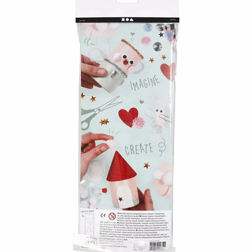 Læg indholdet frem og se, hvad dit barn finder på at kreative påfund. Tilføj gerne en saks. Eller brug dem til invitationer til fødselsdag. Mulighederne er mange med den lille kreapakke.
