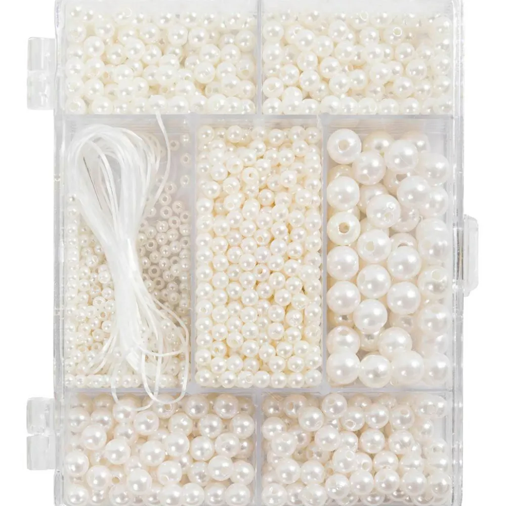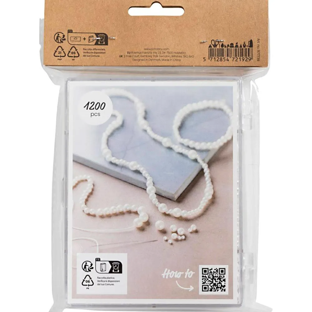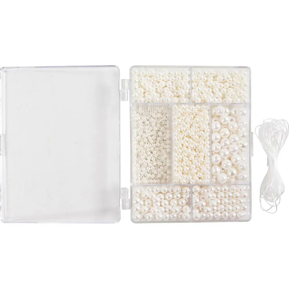 Her er i over 850 voksperler, som ligner små perlemorsperler og venter på at blive til armbånd, halskæder eller måske øreringe, der kan fylde et helt smykkeskrin, hvis du har dele liggende i forvejen at lave øreringe af. Mulighederne er mange og perlerne stiller også gerne op til kreative syprojekter eller andet, hvor de fine perler i forskellig størrelse kan pynte.