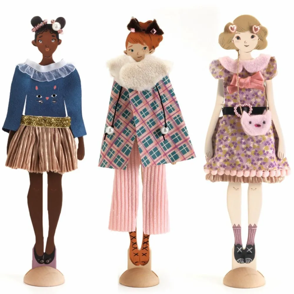 Sættet er en sjov nytænkning af påklædningsdukker, for her skal dukkerne klædes i tøj, dit barn selv samler og pynter – uden at skulle sy delene sammen.
