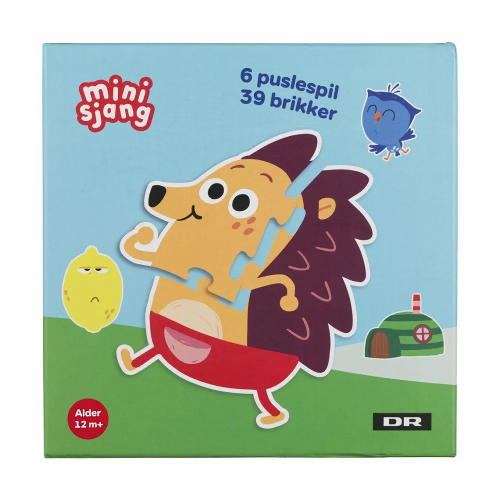6 små puslepil med 3-8 brikker, så der er lidt forskellige sværhedsgrader. Alle med Minisjang-maskotten Børste og hans venner.