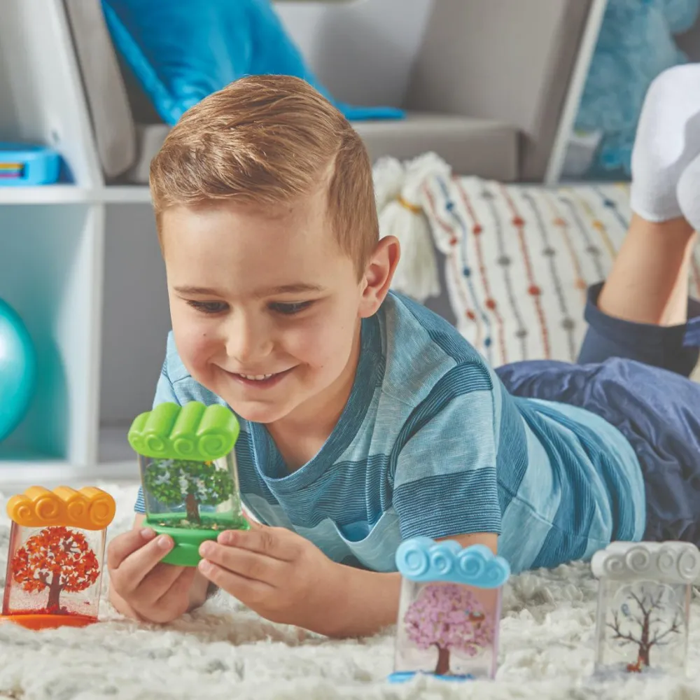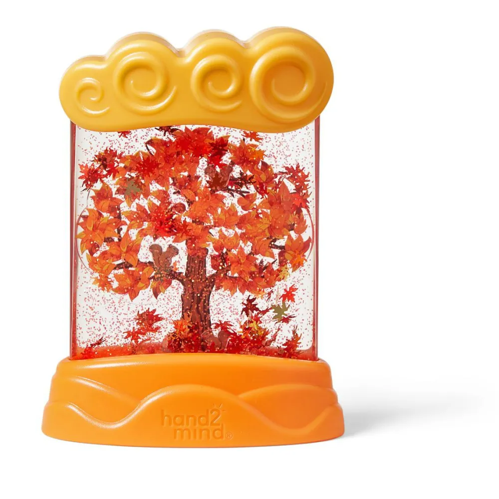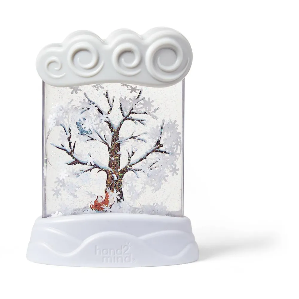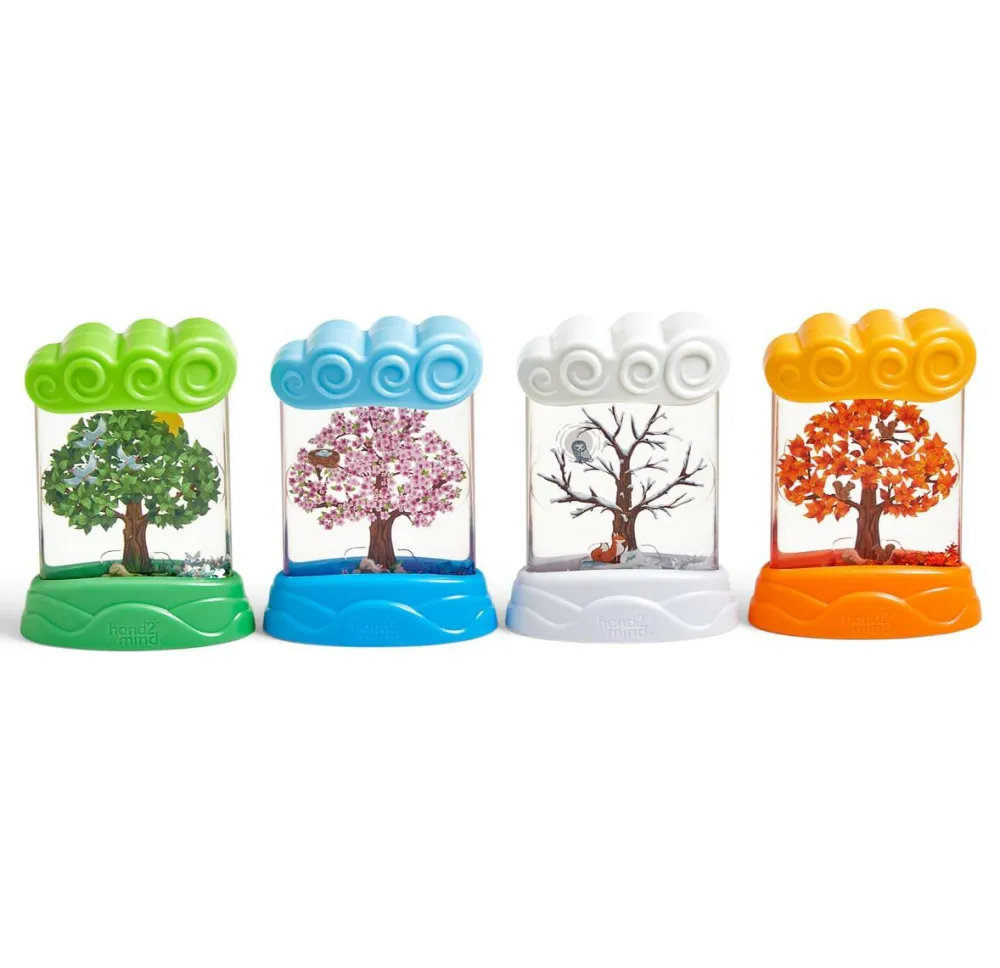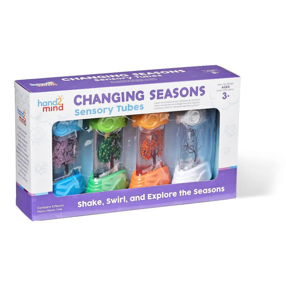 Ligesom en snekugle kan I ryste de fire rør og se bl.a. regndråber, sommerfugle, efterårsblade og snefnug hvirvle rundt, som det passer sig til de fire årstider.