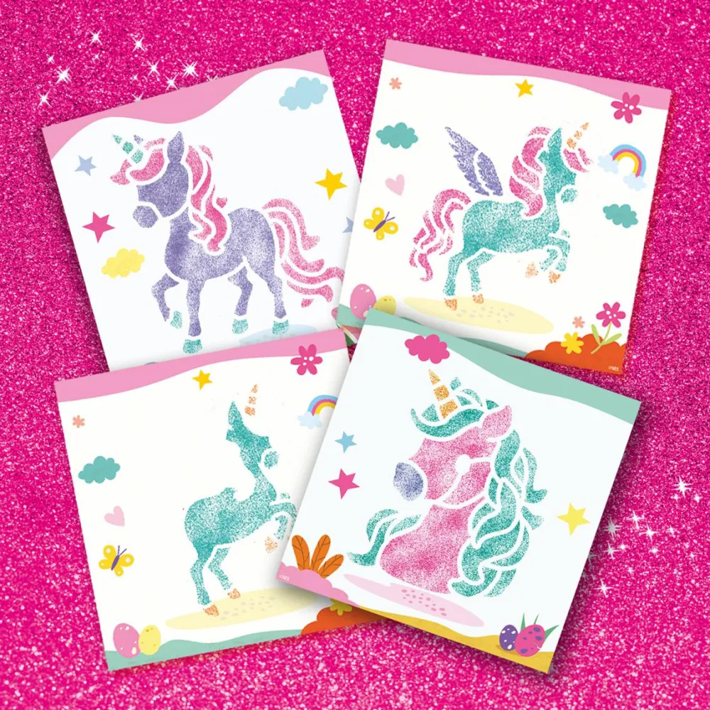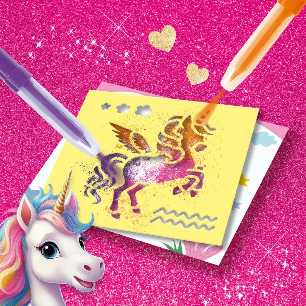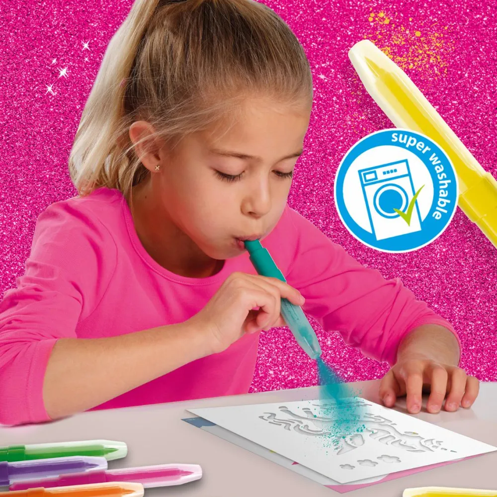 Her kan dit barn kreere fine enhjørninger i en fart med få pust i pustetusserne. Brug flere farver oven på eller tæt på hinanden og få en flot airbrush-effekt. Spidserne af tusserne er gode til at tegne fine detaljer.