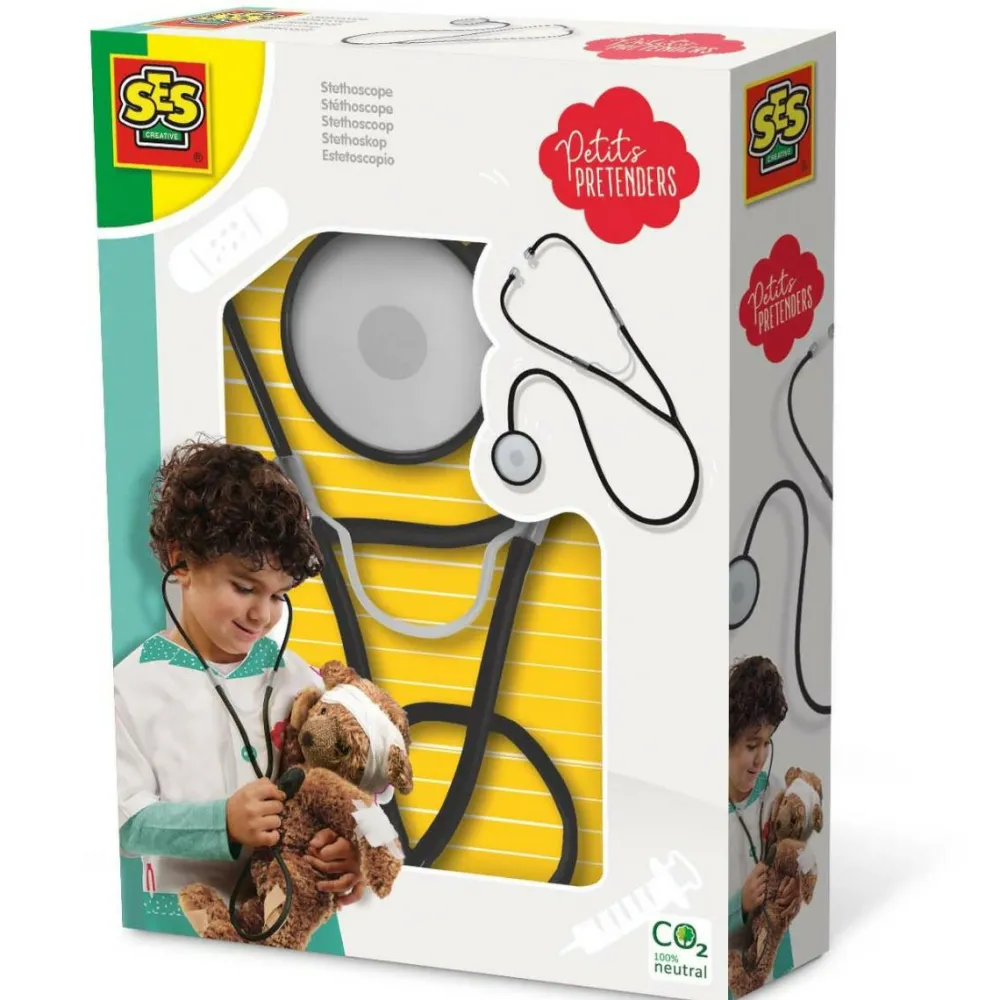 Med et stetoskop kan dit barn lytte til bamses hjerte.
