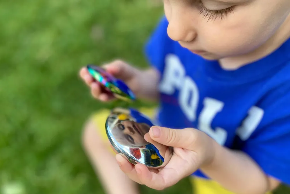 Dit barn kan med nysgerrighed og lidt tålmodighed forsøge sig med at stable stenene, eller I kan lave sjove ansigter og bare lade jeres synssans have en fest med at observere lysets brydning i sansestenenes ståloverflade.