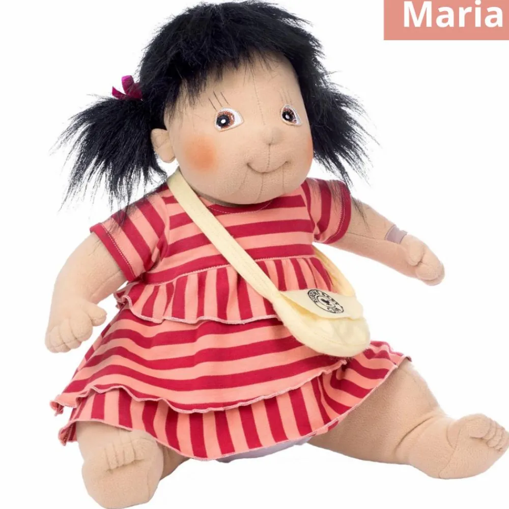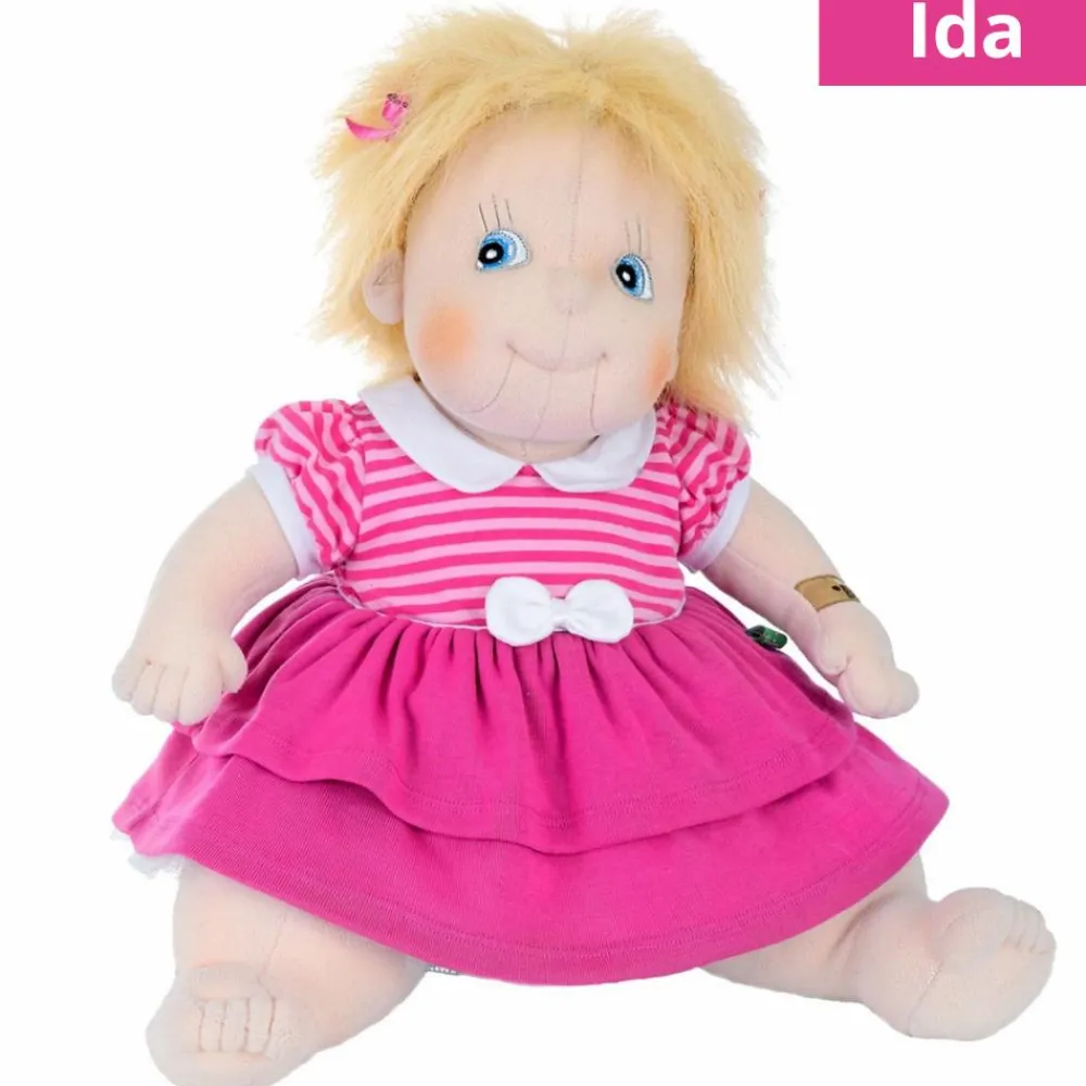 Dukken er lavet i en blød polyester fleece, og er fyldt med polyester fibre. Uden anatomisk køn. Bunden er fyldt med granulat, som gør, at dukken har en god tyngde, og dermed sidder bedre.