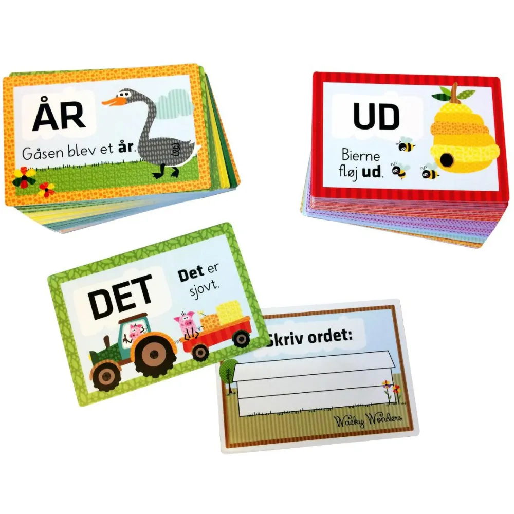 På hvert af de 120 kort er der et motiv og en sætning, som passer til ordet, og på bagsiden er der et skrivehus, så dit barn kan se, hvordan ordet skrives.