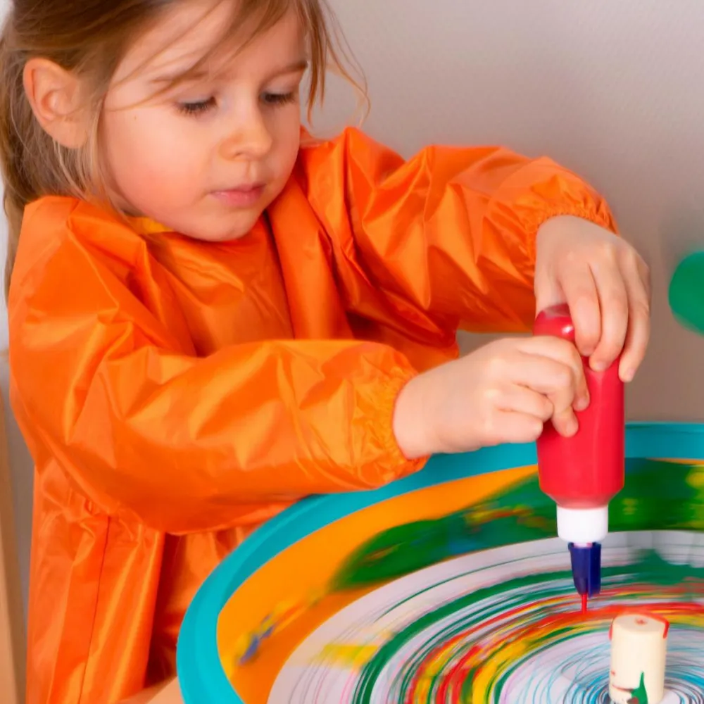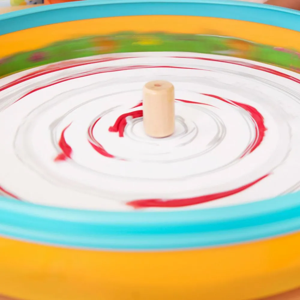 Så snurrer slyngen papiret rundt, og imens skal I så hælde eller dryppe tempera-maling på papiret. Malingen finder du her. Der sker virkelig ting og sager, for centrifugalkraften presser malingen udad.