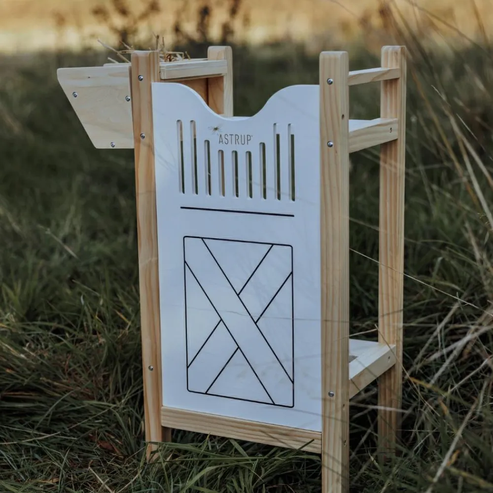 Hesteboksen er 65,6 cm høj og 24,5 cm bred så den passer i størrelsen til to kæpheste, der kan stå og hygge sig og slappe af og få en bid mad fra fodertruget, som kan hænges på siden.