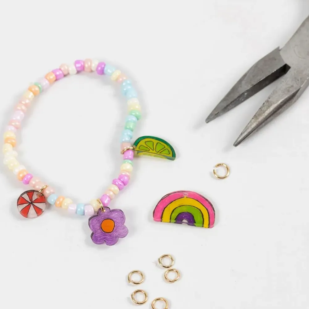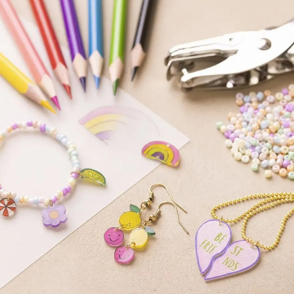 Indhold: Krympeplast, farveblyanter, perler, ørekroge, kæde, hultang.